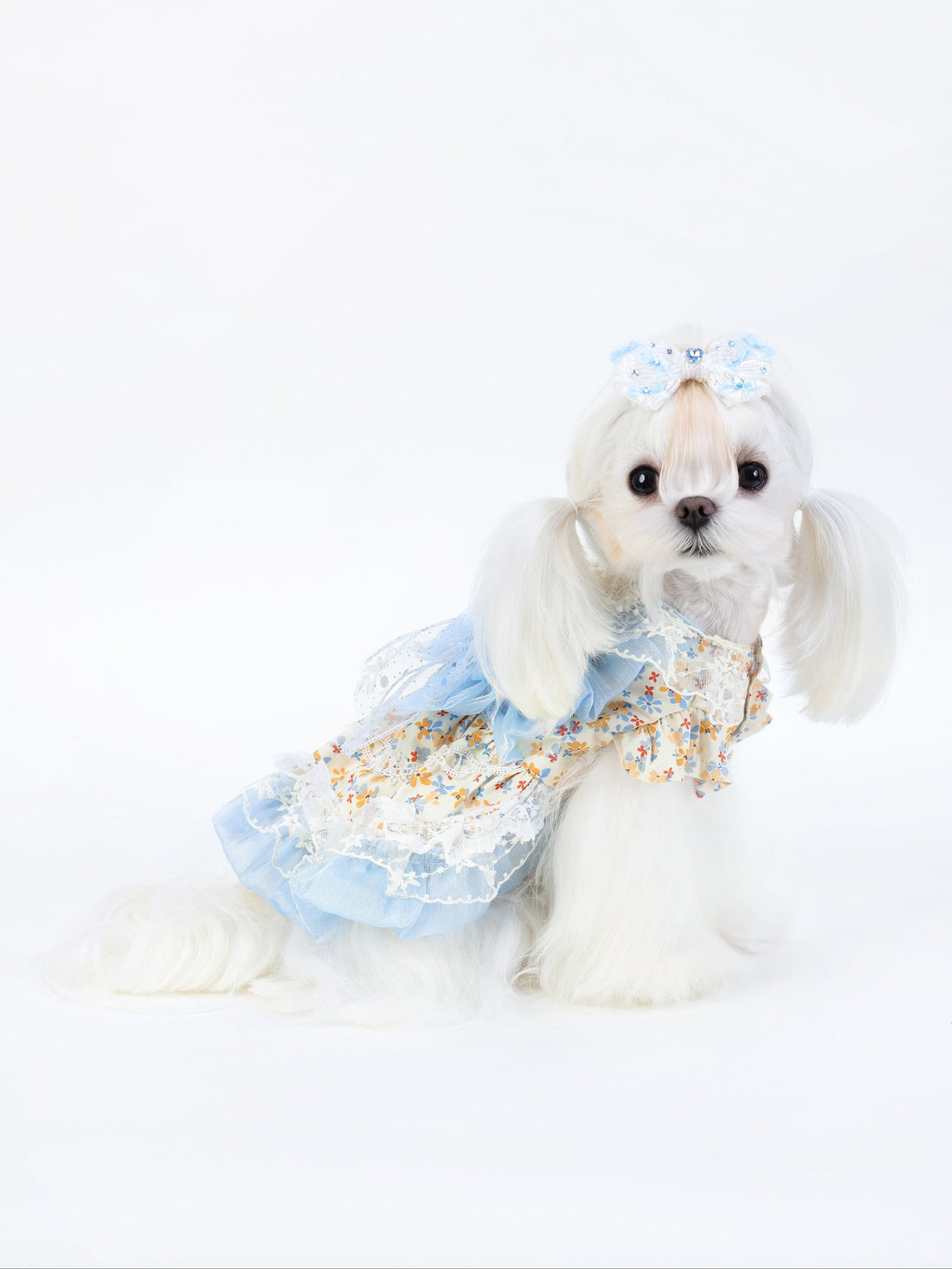 A fairytale-inspired pet dress featuring sky-blue ruffles, floral lace, and a sparkling organza bow. Perfect for...