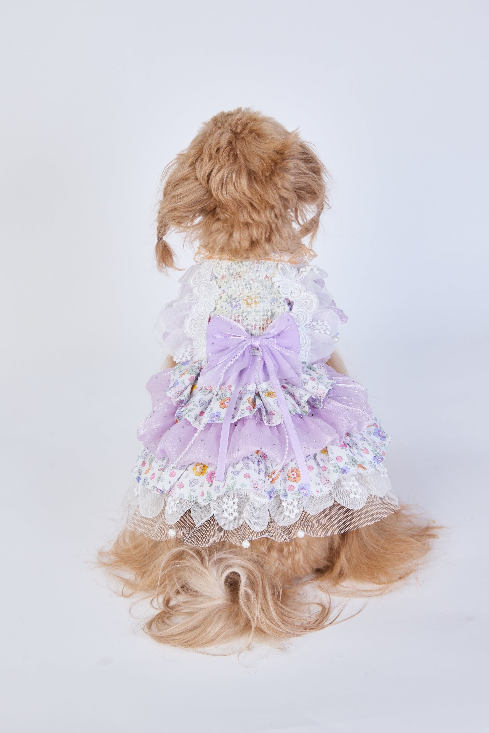 Soft florals drift gently through layers of pale lavender. Light ruffles, delicate lace, and a quiet bow move softly with every step. Made for little ones who feel like a sweet daydream — tender, playful, and deeply loved.