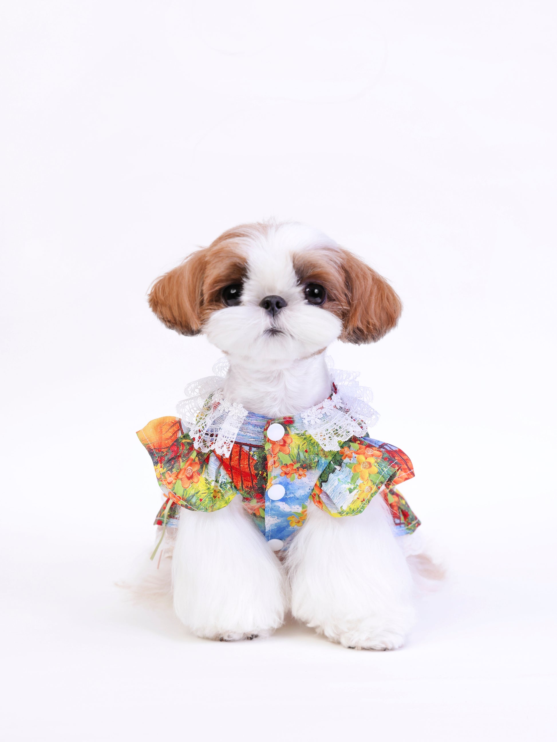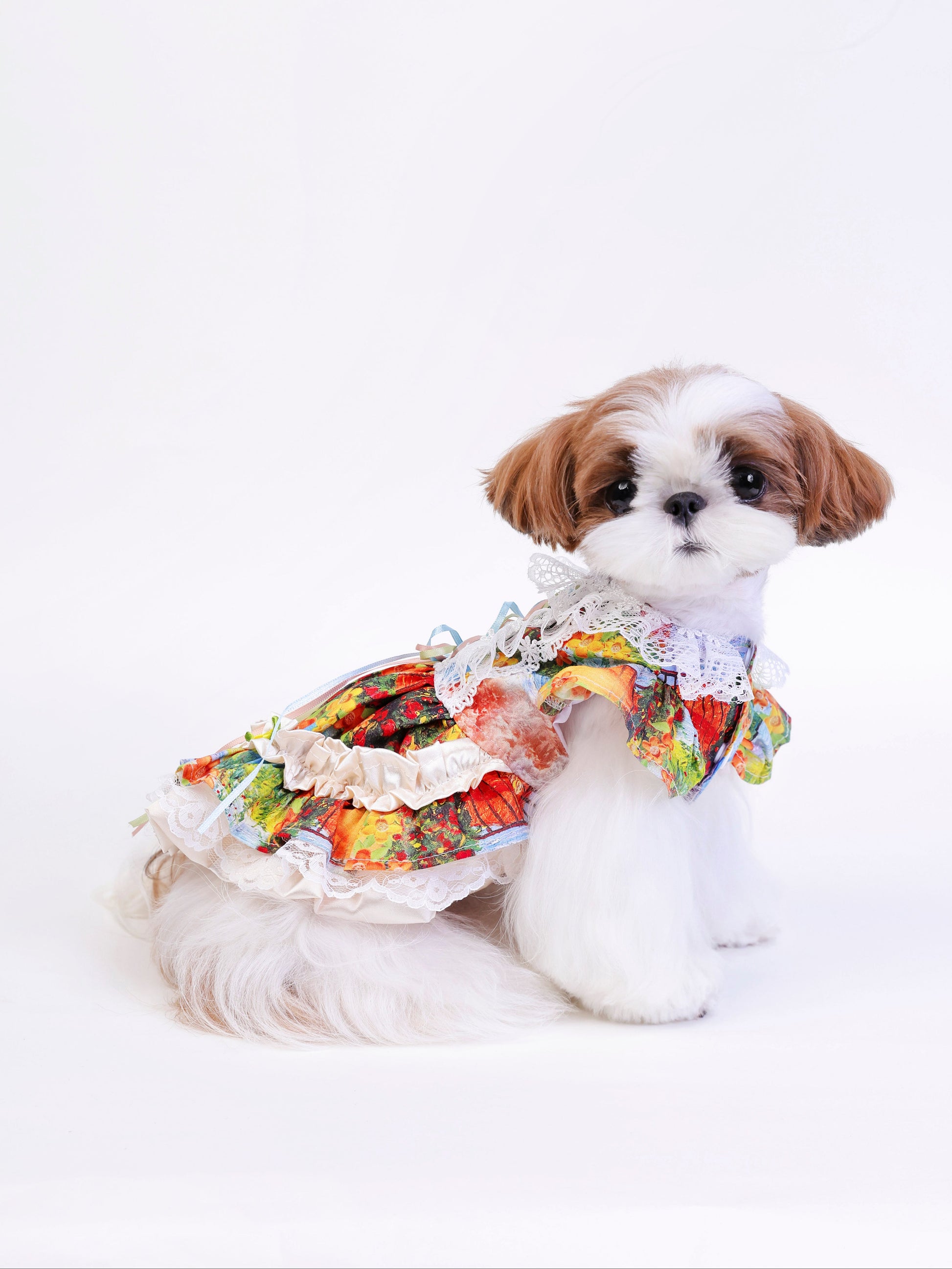 Garden Sonata is a whimsical, painterly pet dress bursting with color and charm, inspired by the romance of European garden strolls and antique lace corsetry.