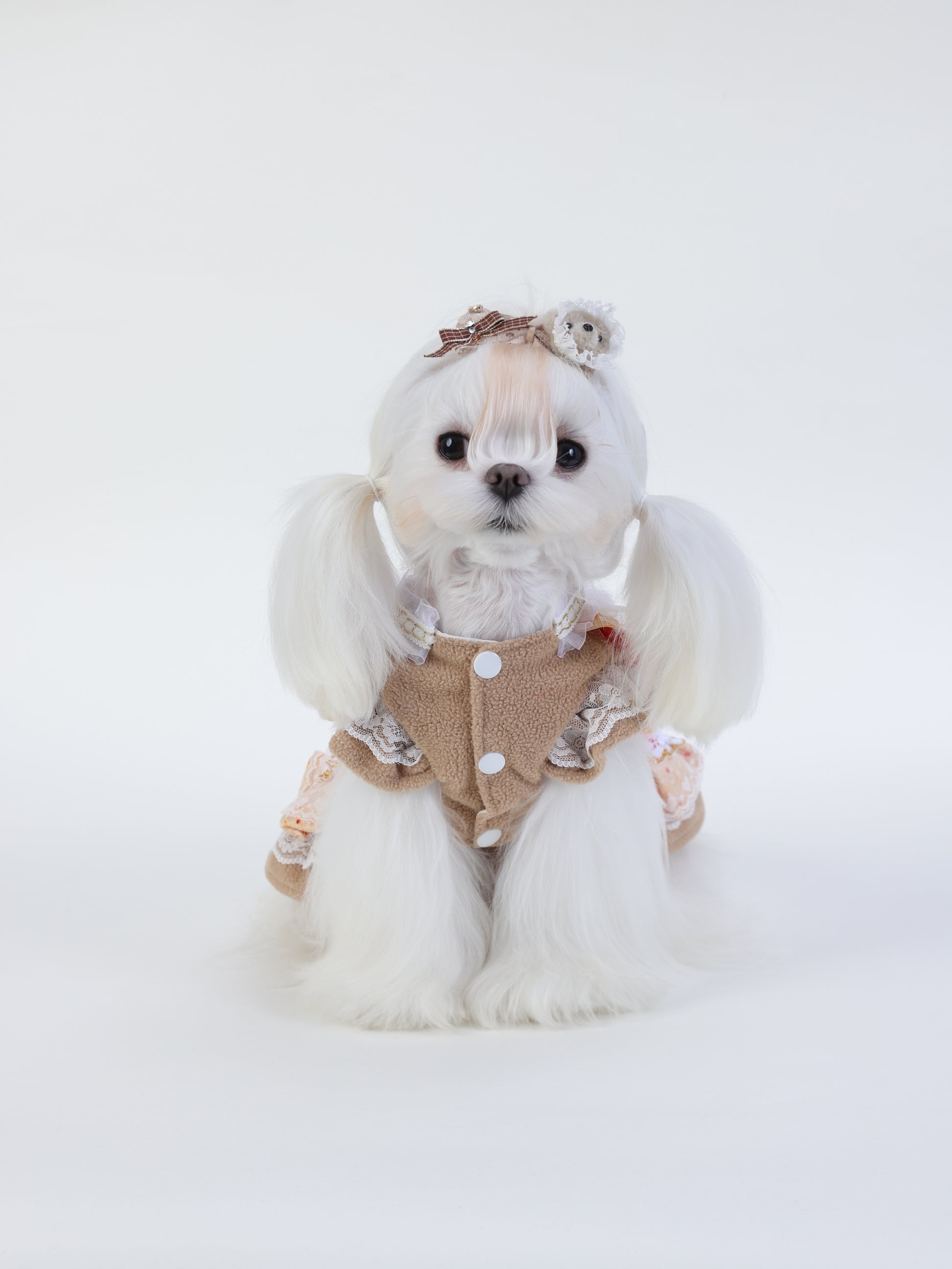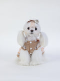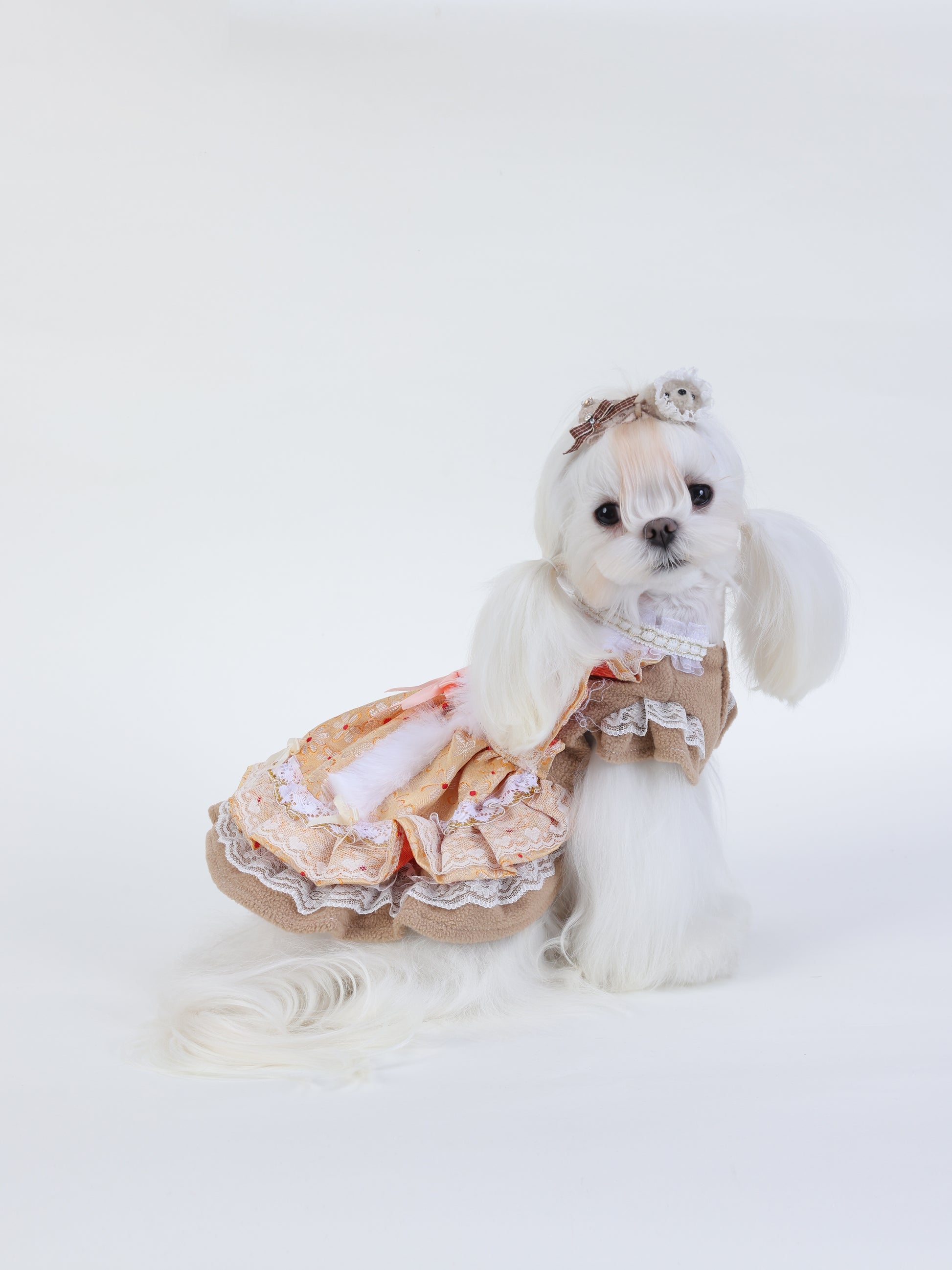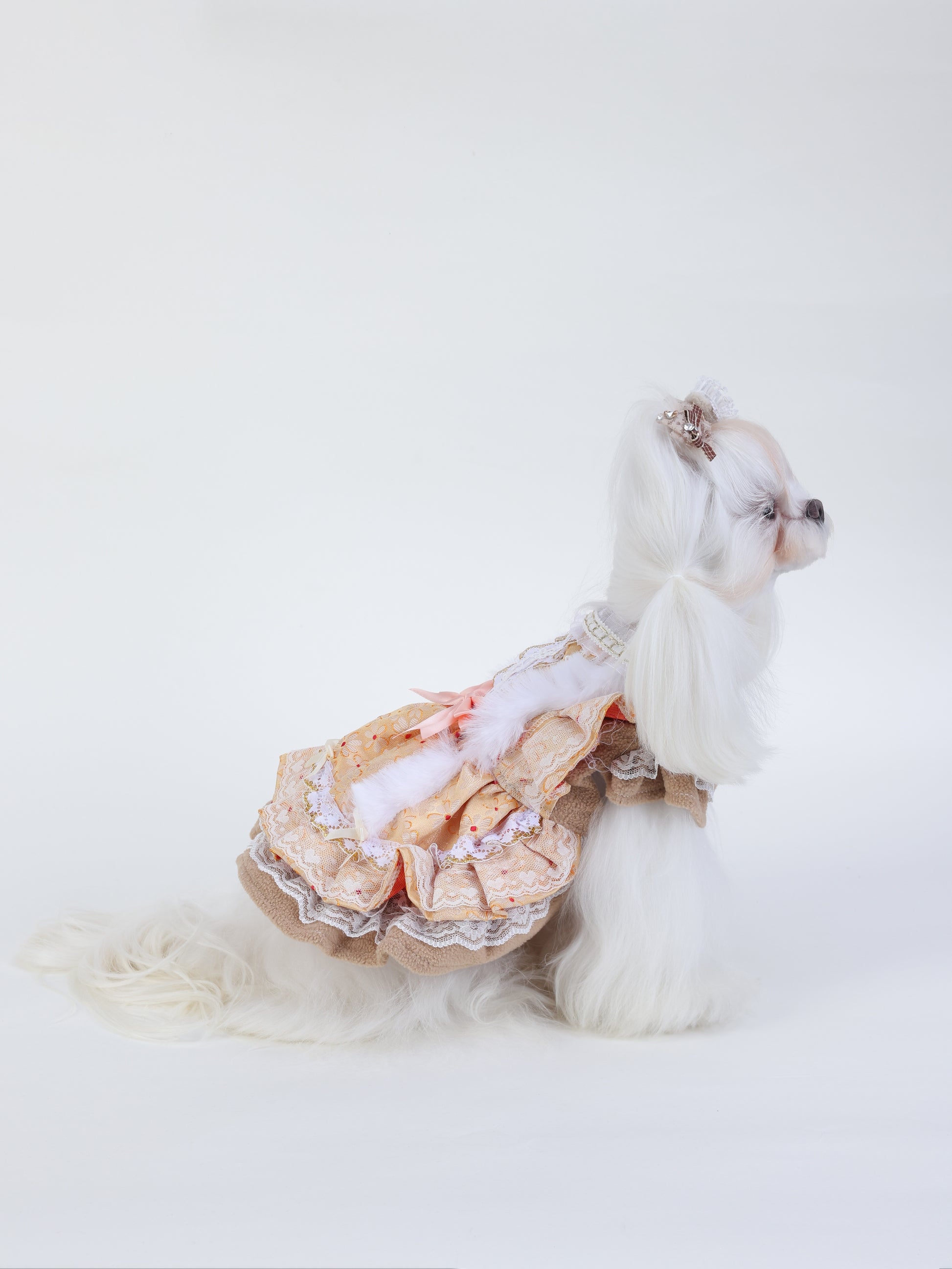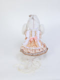 This lovely cream-toned pet dress is adorned with golden stars, lace frills, and fluffy yellow pom-poms. The oversized bow at the back adds a fairy-tale flair. Perfect for pets who love to dazzle in soft elegance.