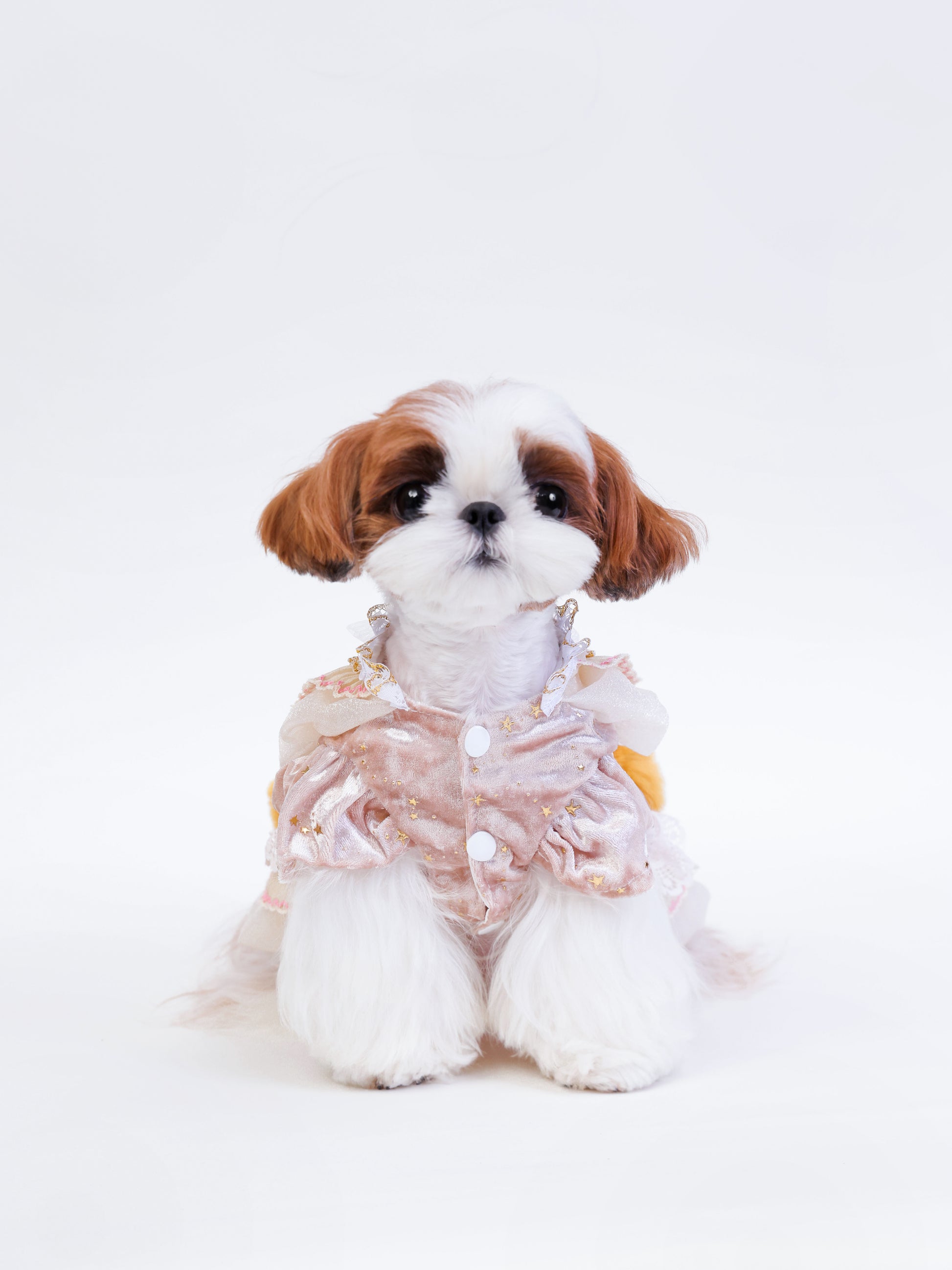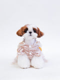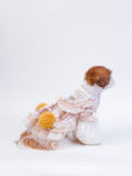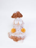 This dreamy dress features layers of soft cream and pale yellow ruffles with shimmering gold star patterns. Delicate lace trims and oversized bows add a fairy-tale charm. Perfect for making your pet sparkle like a star.