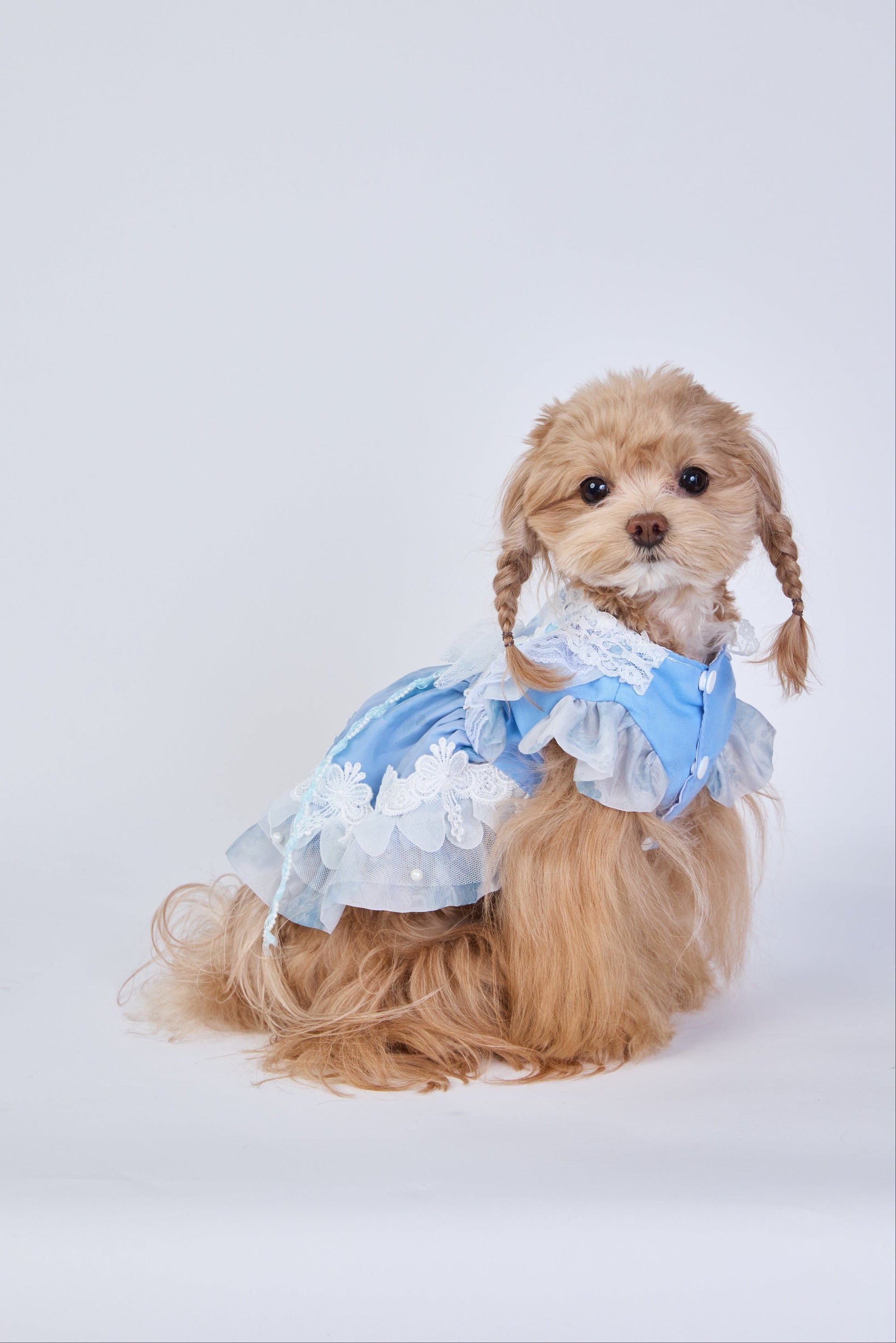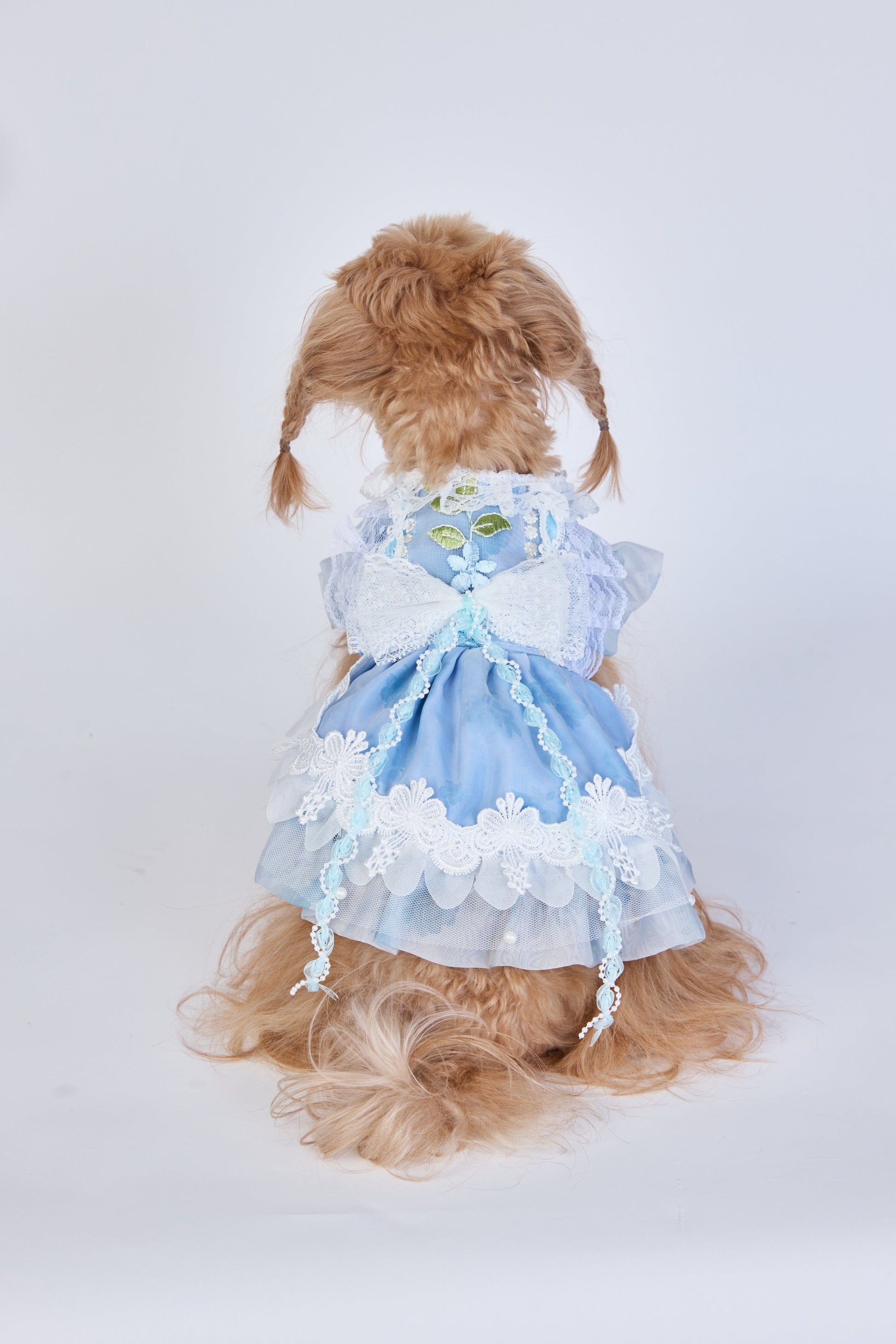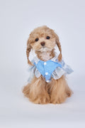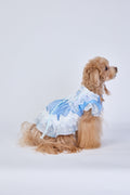 Snow Petal features a charming sky-blue fabric with white floral embroidery and delicate lace trim. The oversized bow at the back and the leaf motif on the bodice bring out an elegant and fairy-like charm. Perfect for pets who shine in soft, dreamy aesthetics.
