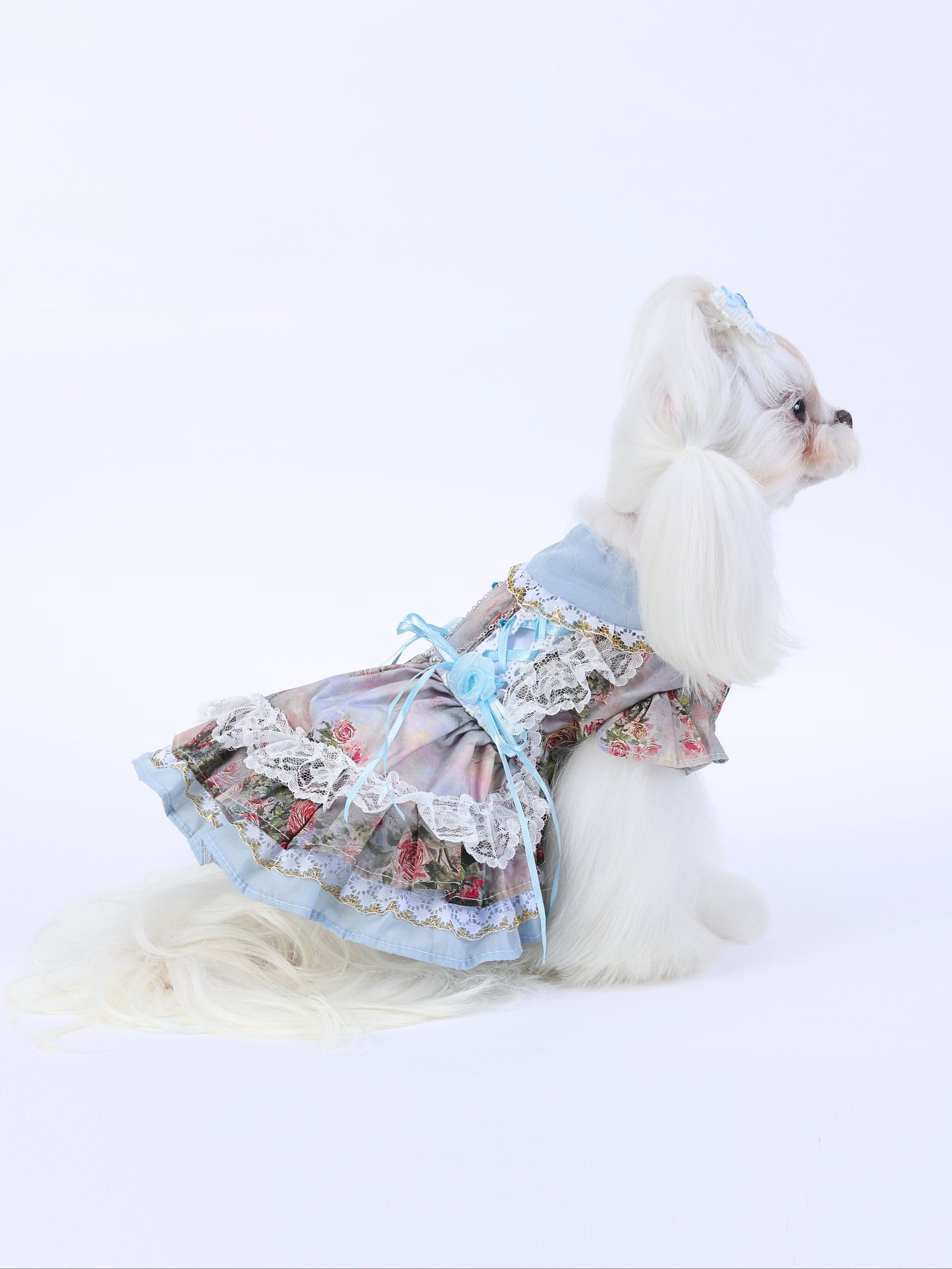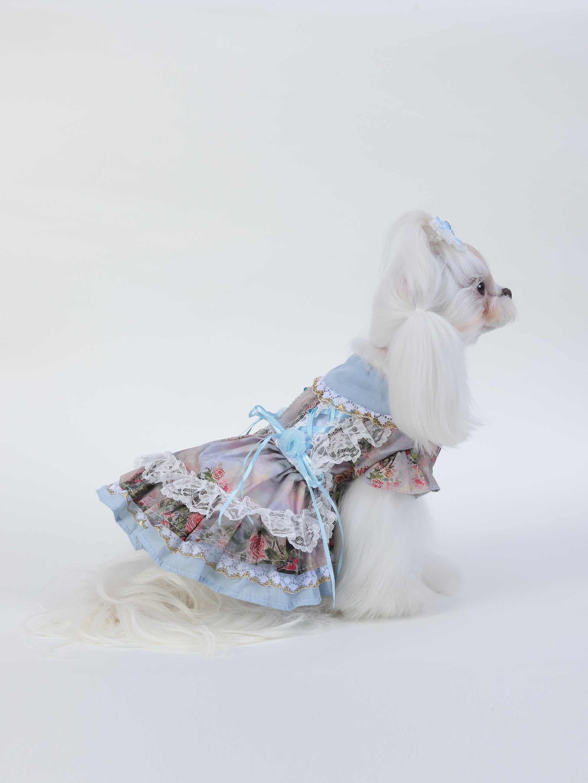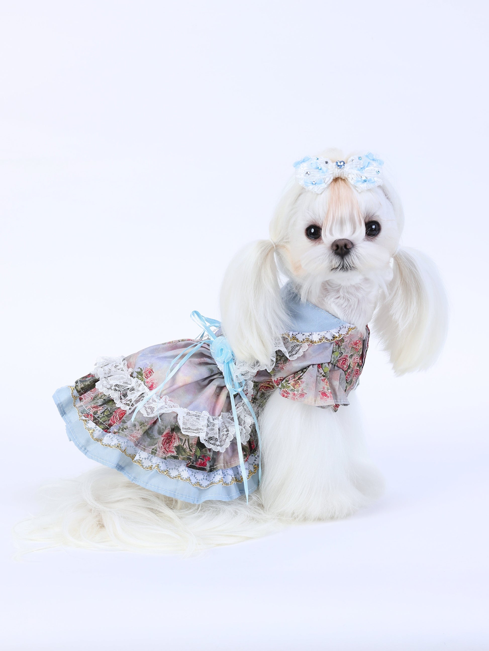 Garden Serenade wraps your pet in vintage floral elegance. Delicate rose blooms dance across soft fabric, framed with pastel lace and powder blue ribbons. A dreamy look for pets who belong in an English garden at golden hour.