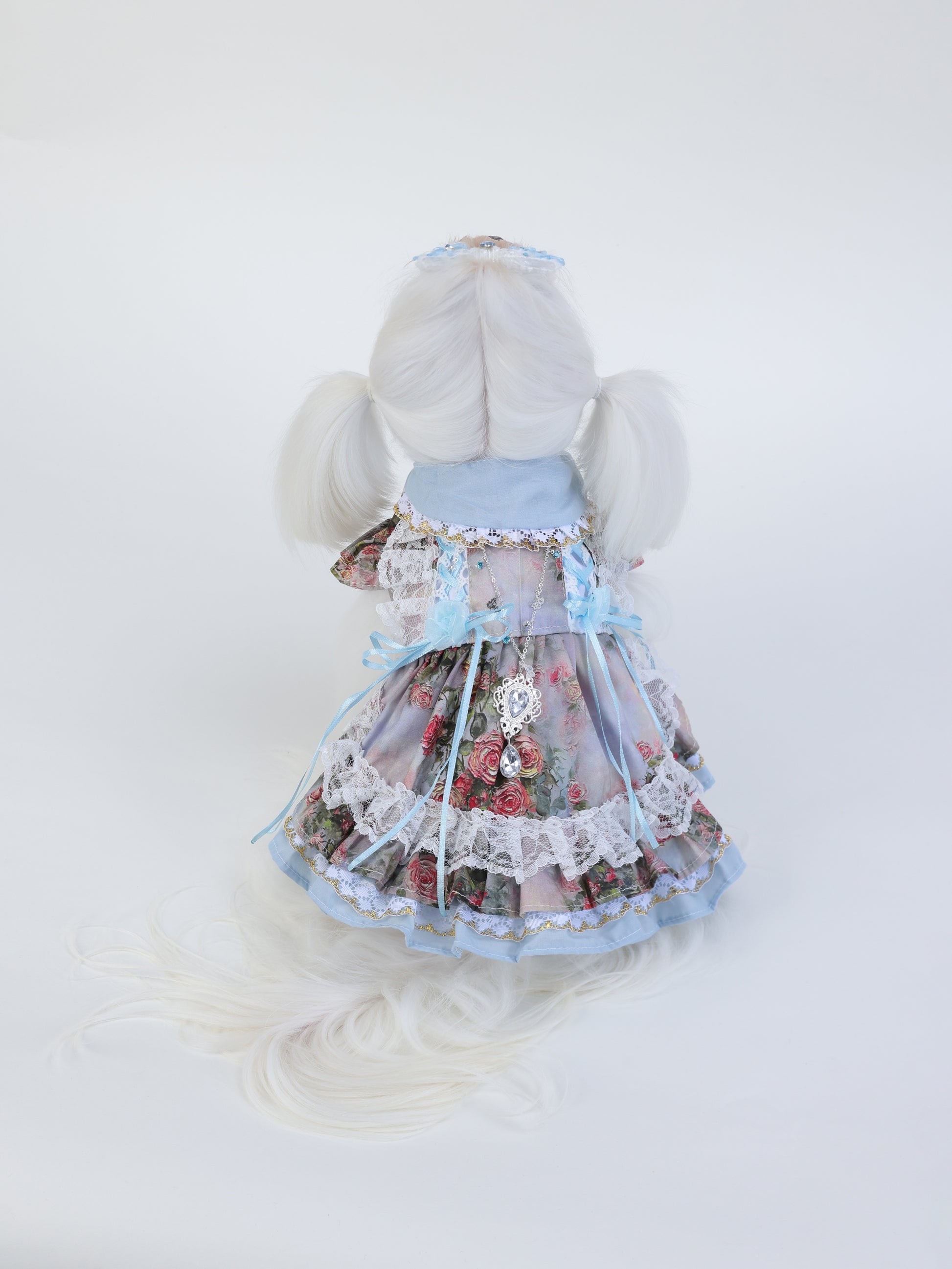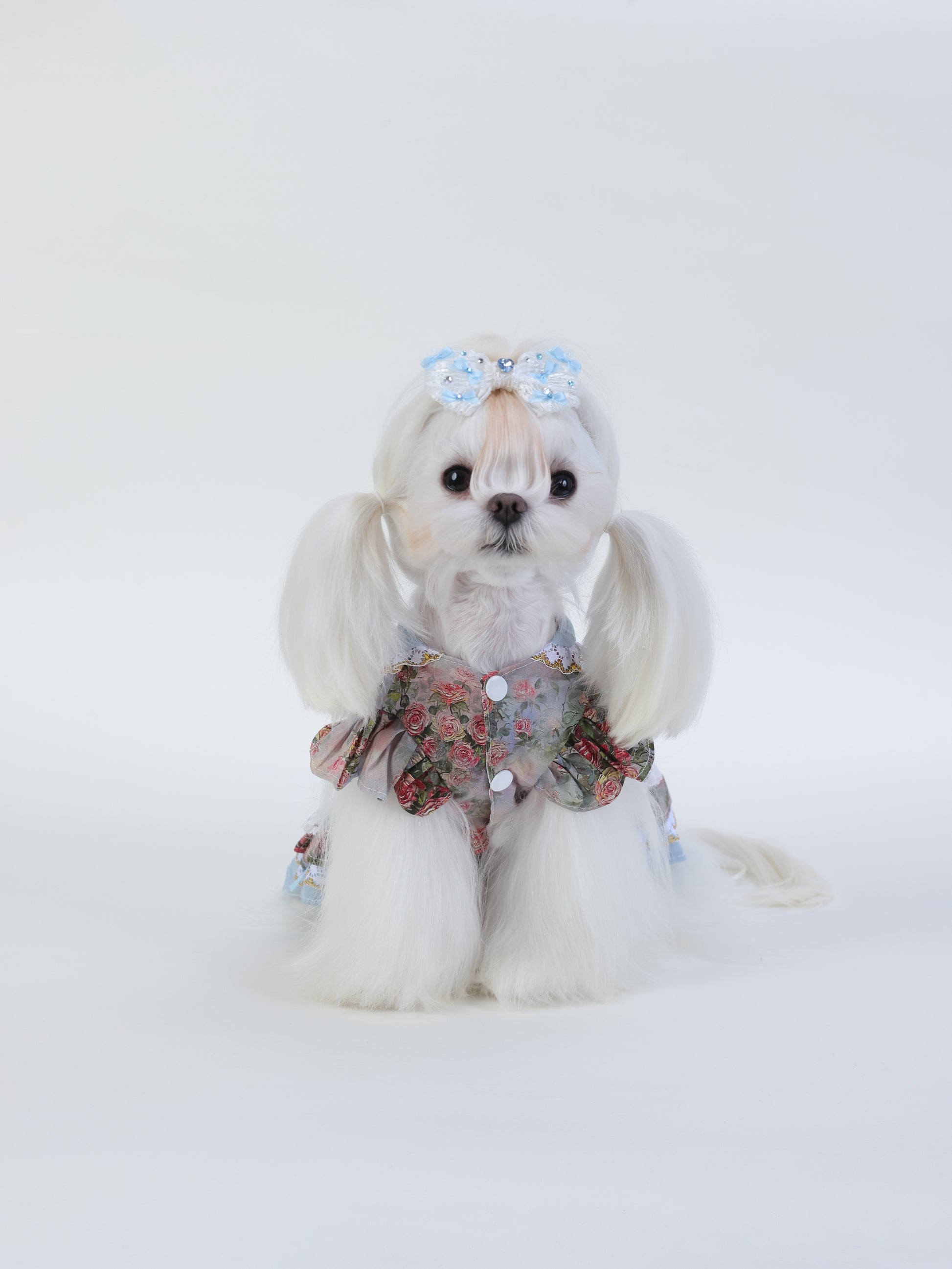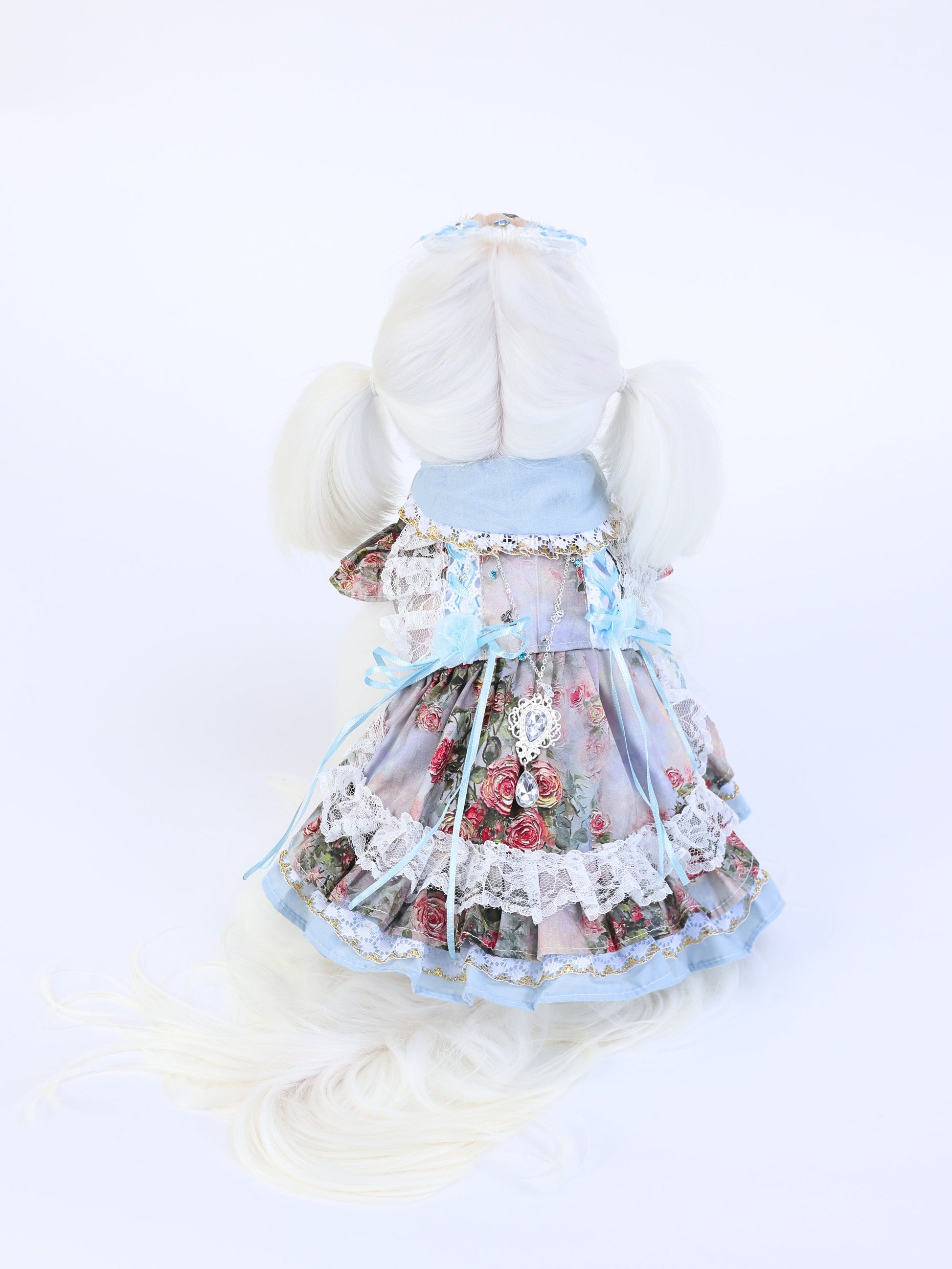 Garden Serenade wraps your pet in vintage floral elegance. Delicate rose blooms dance across soft fabric, framed with pastel lace and powder blue ribbons. A dreamy look for pets who belong in an English garden at golden hour.