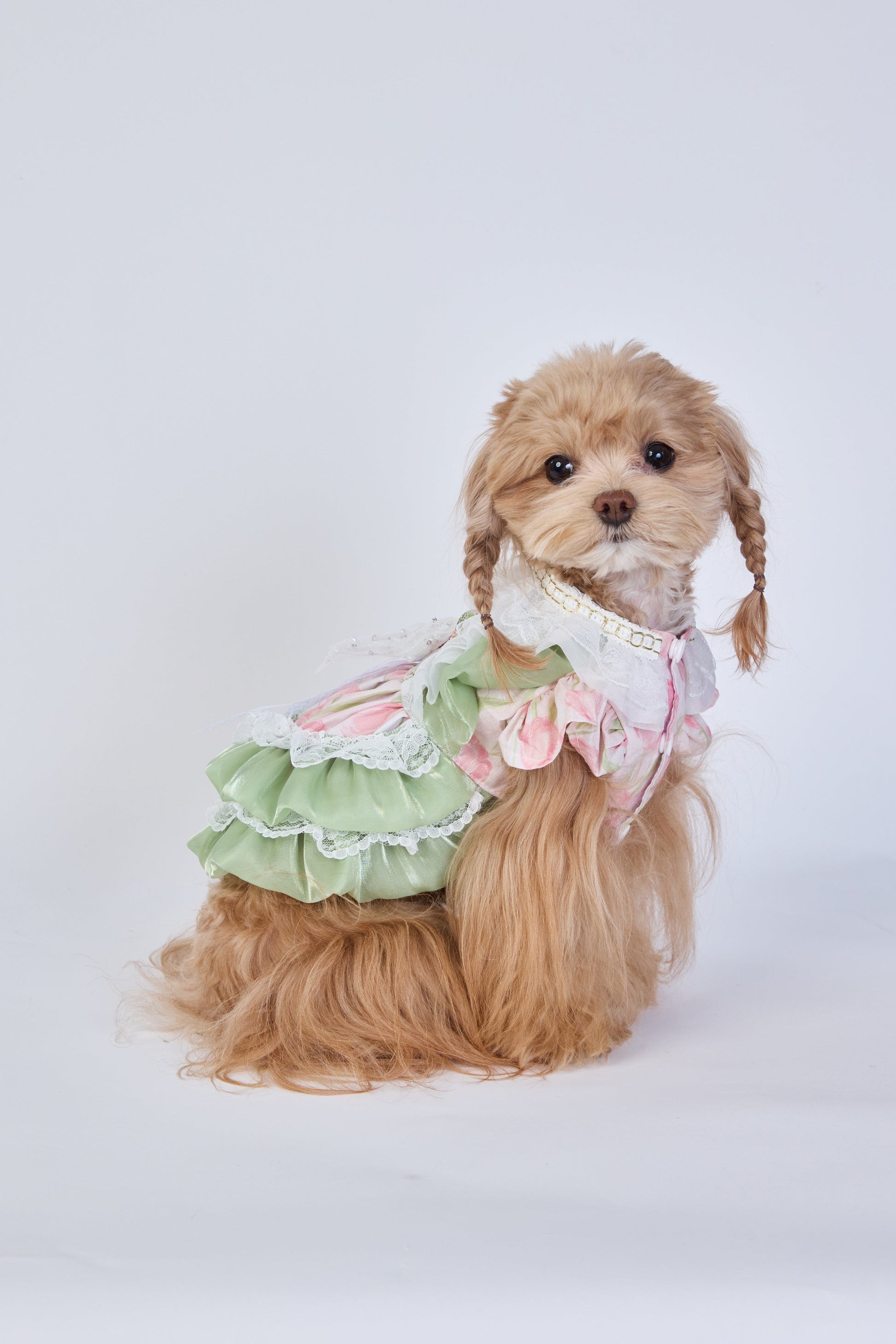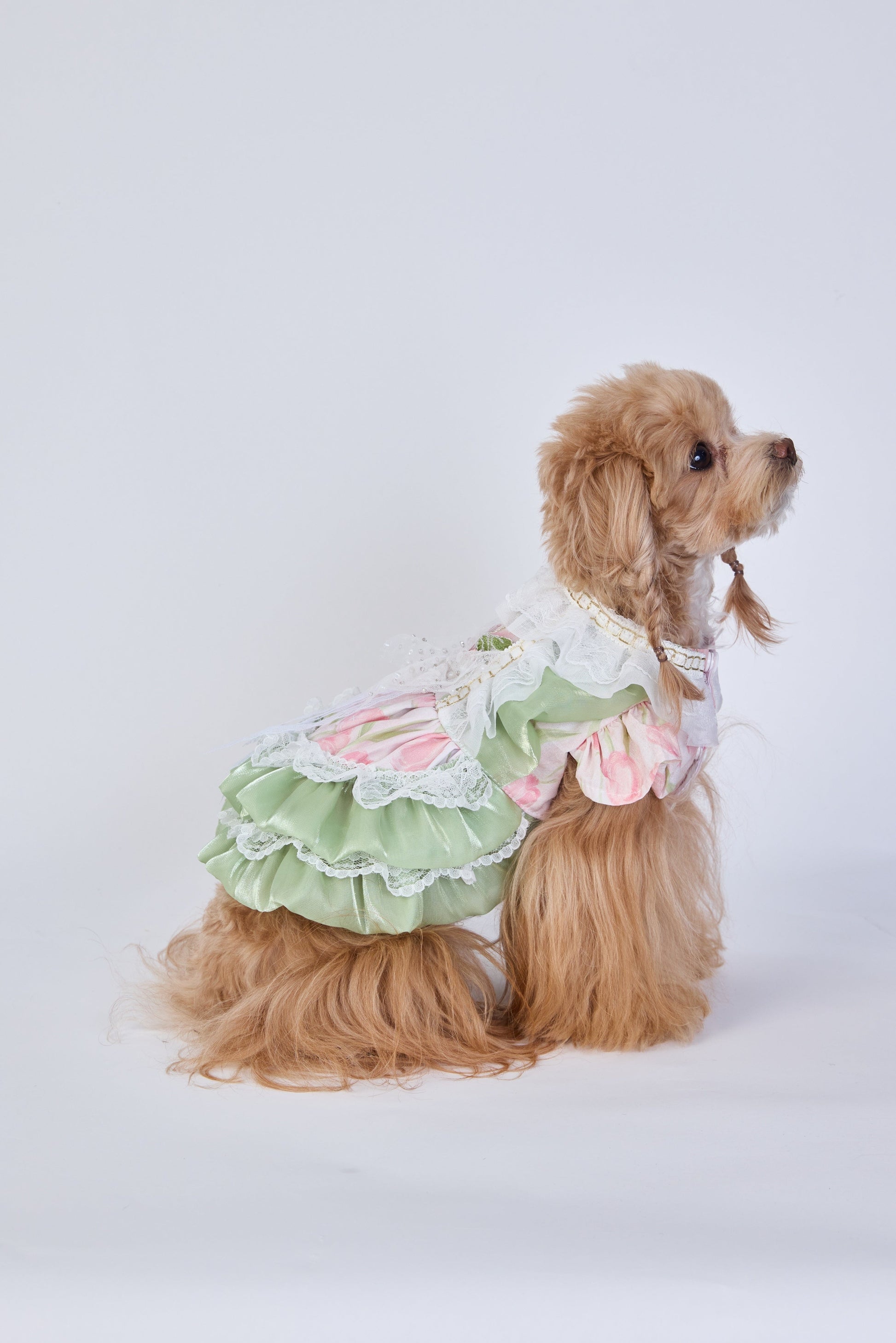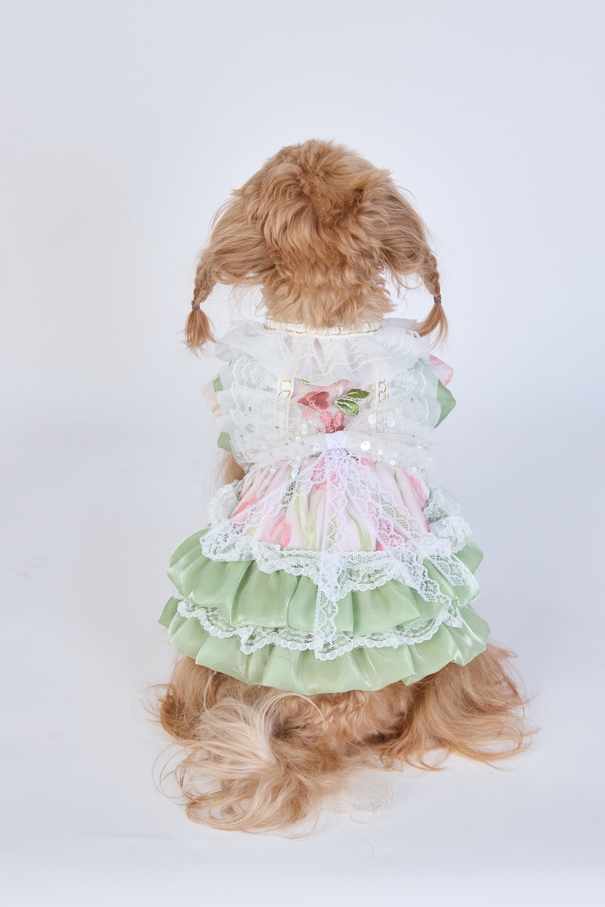 Tulip Breeze features a soft pink tulip floral base with delicate white collar and lace bow accents. The gentle green finish adds a fresh, spring-like touch, making this dress the perfect choice for warm, sunny days. Light and breezy, it’s designed to keep your pet stylish and comfortable.