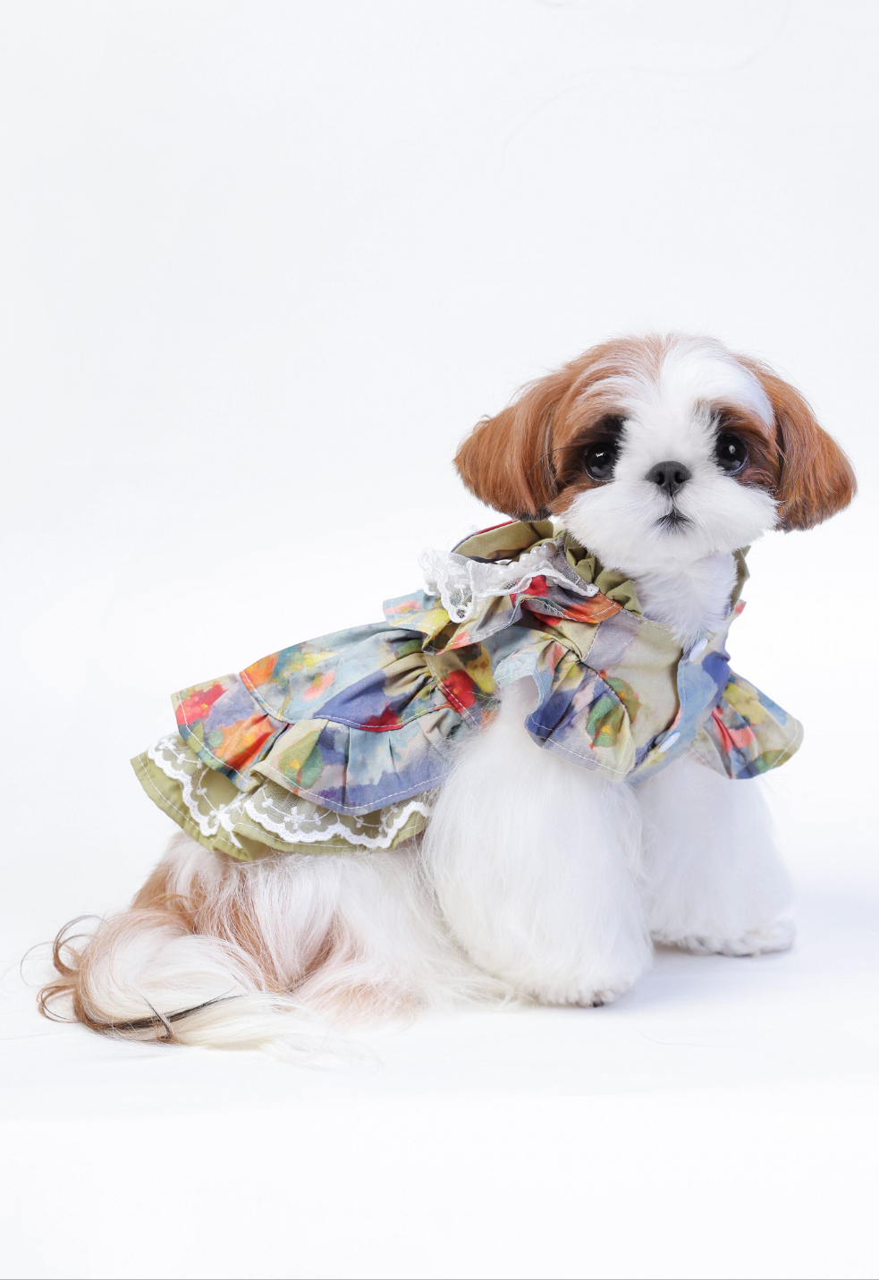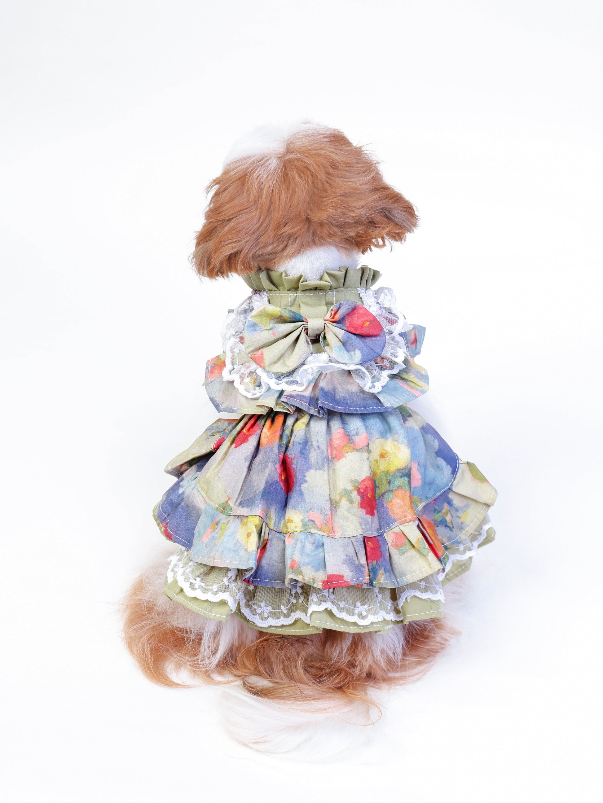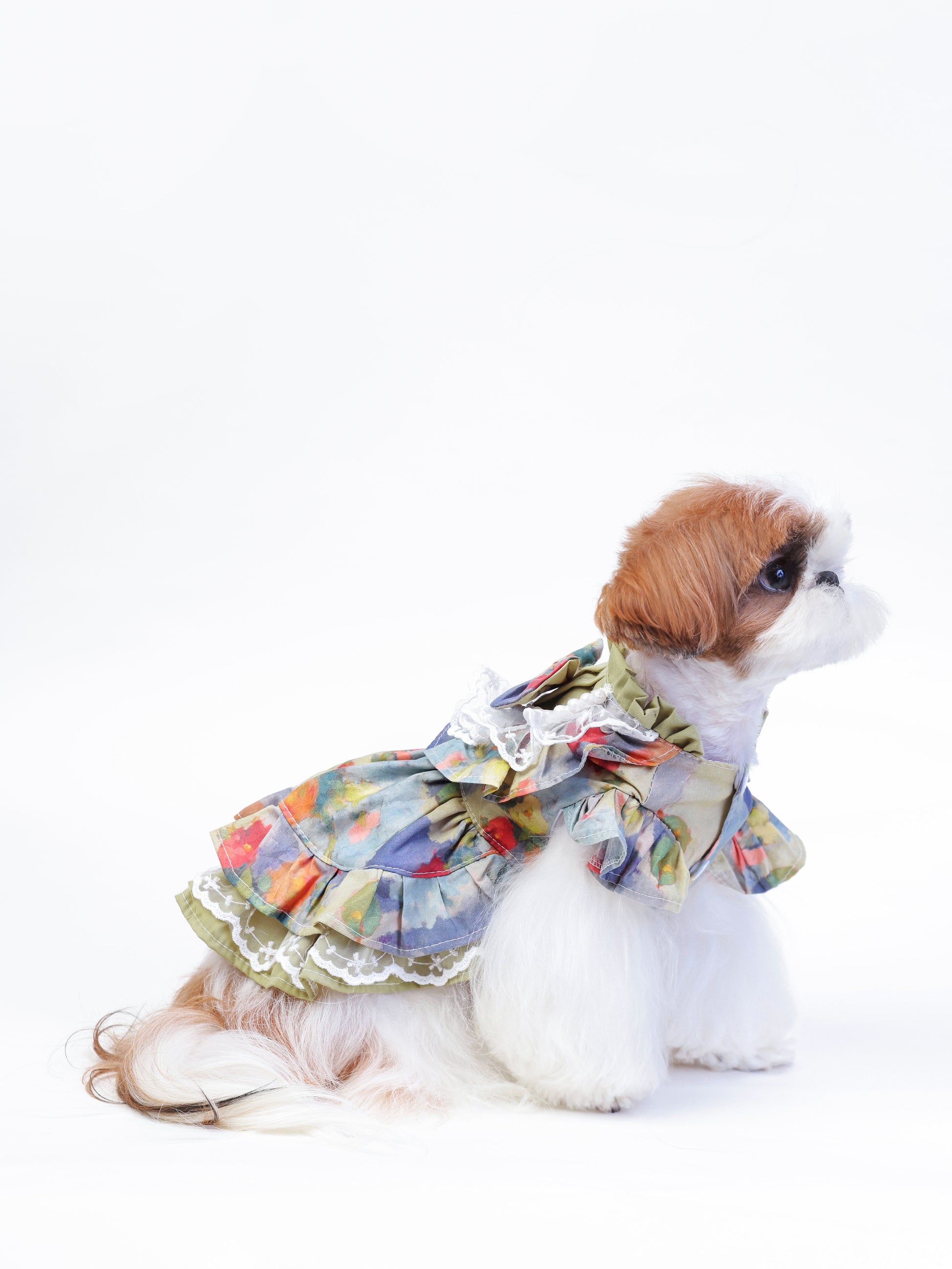 Maple Serenade is a romantic, vintage-style pet dress that blends elegance and warmth with its layered ruffles, delicate lace, and a soft floral print that captures the essence of autumn afternoons.