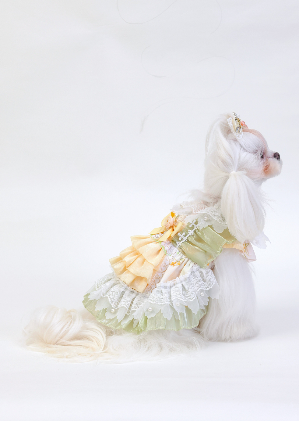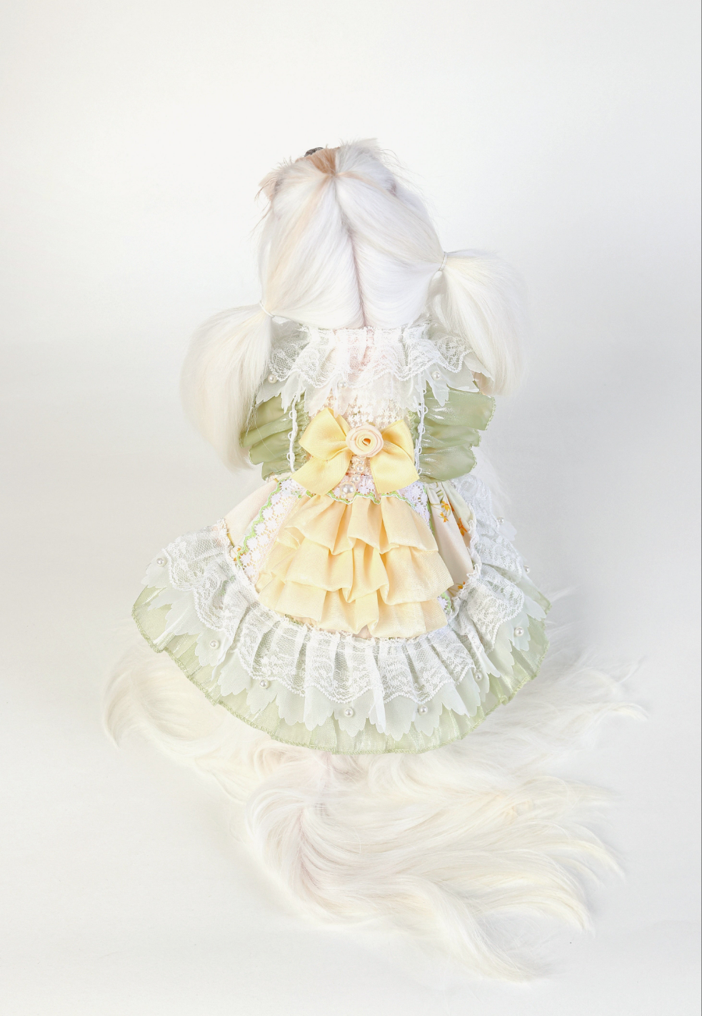 Golden Tide showcases a bold yellow wave pattern, beautifully complemented by a delicate bow and white lace accents. Pearls add a refined touch, while the green olive finish creates a unique and sophisticated look.