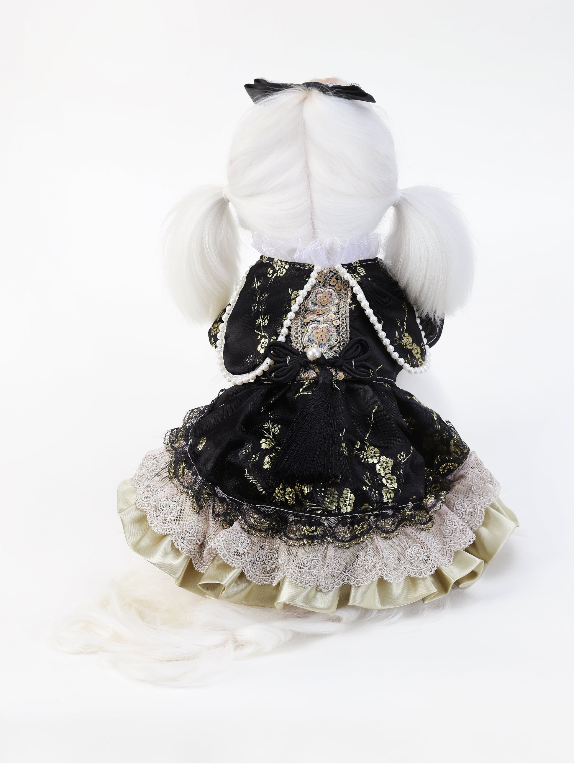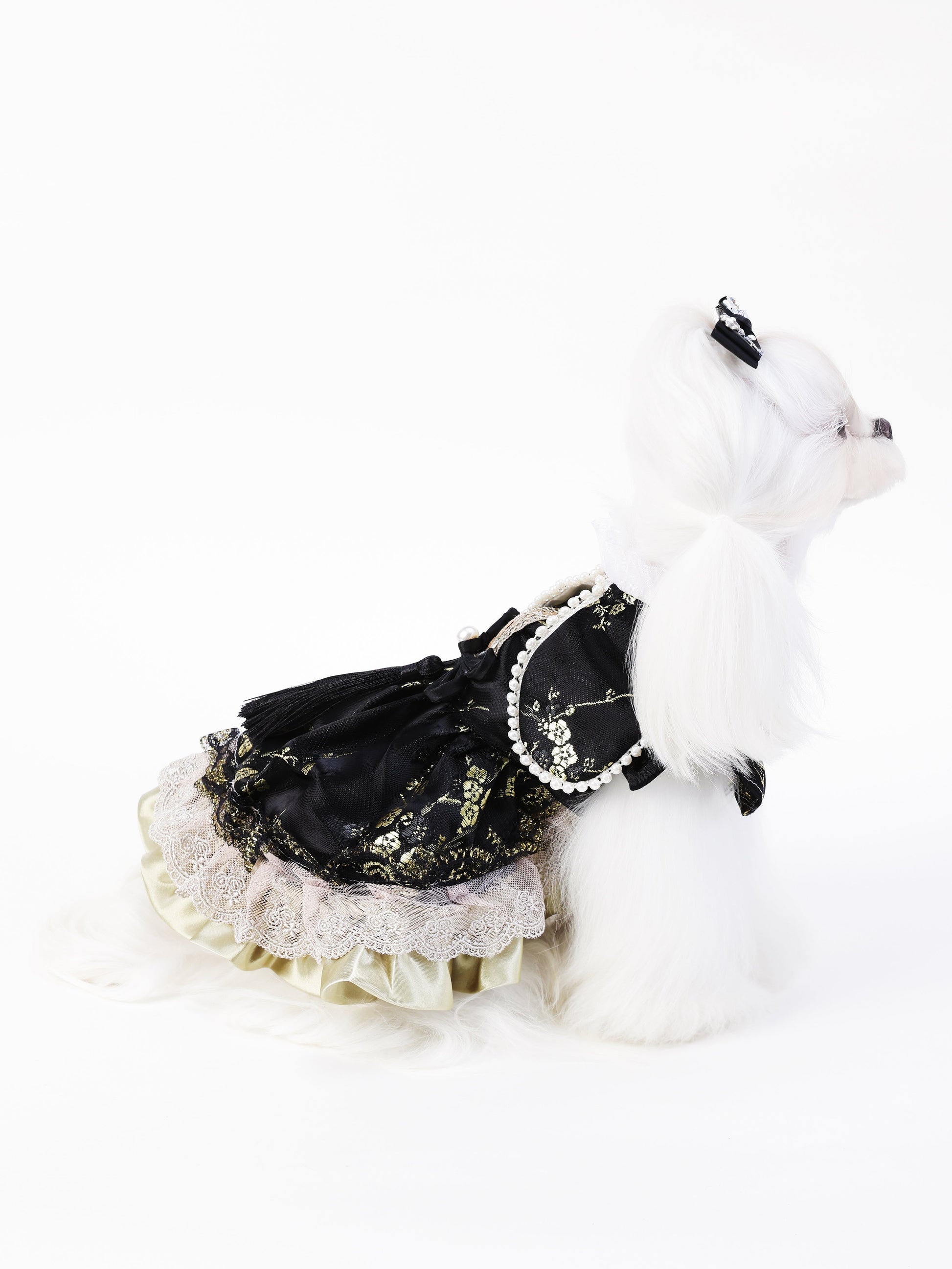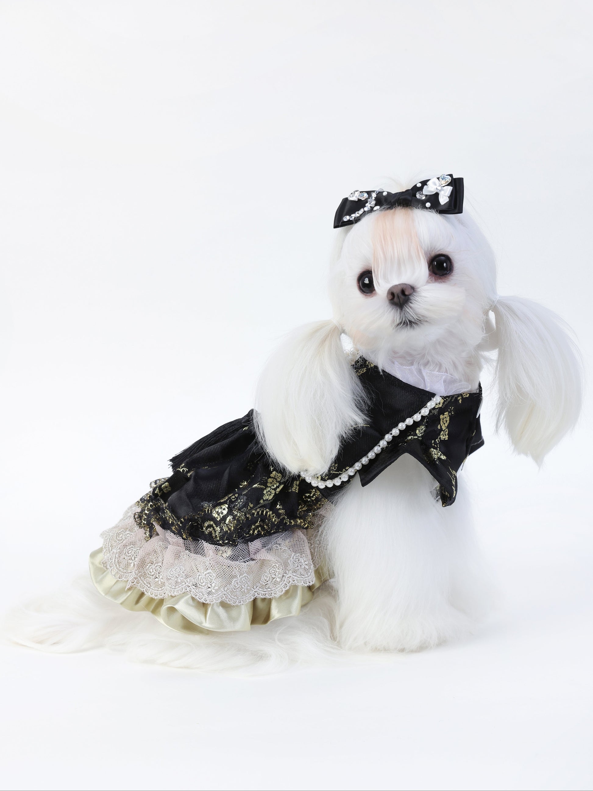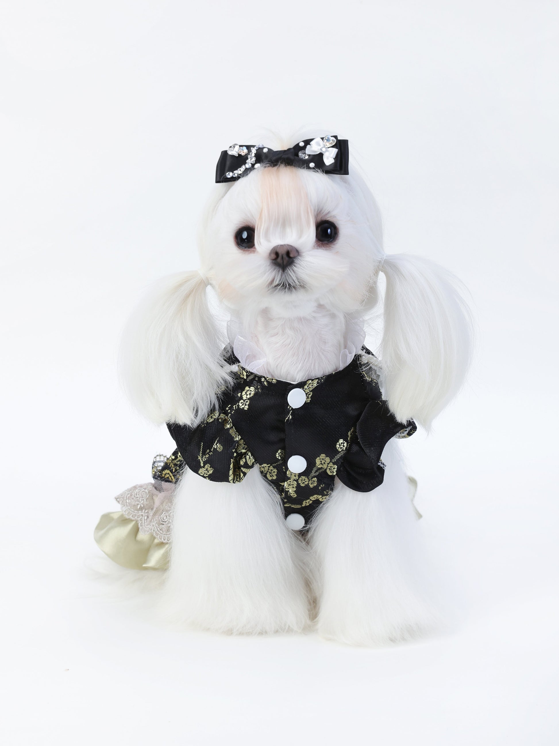 A stunning twist on the traditional qipao, this dress features a sleek black base with white accents and a shimmering finish. The shiny fabric adds a touch of elegance, making it perfect for any formal occasion. Timeless and sophisticated, your pet will stand out with grace.