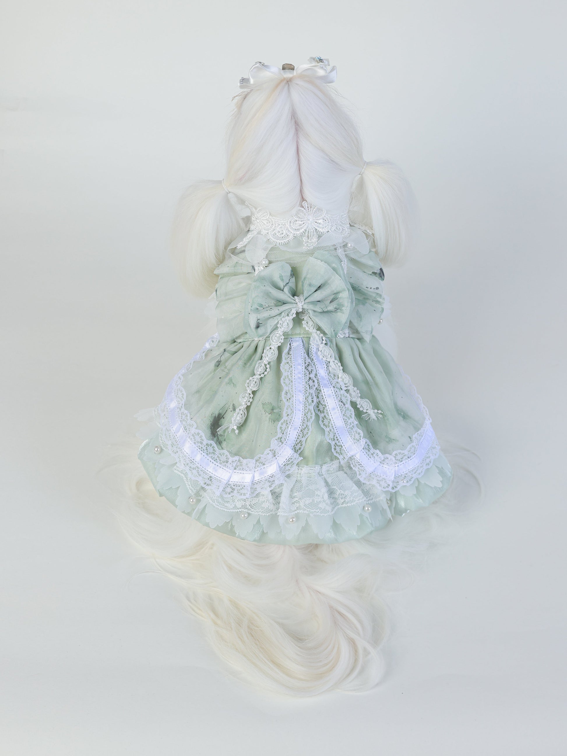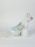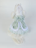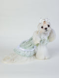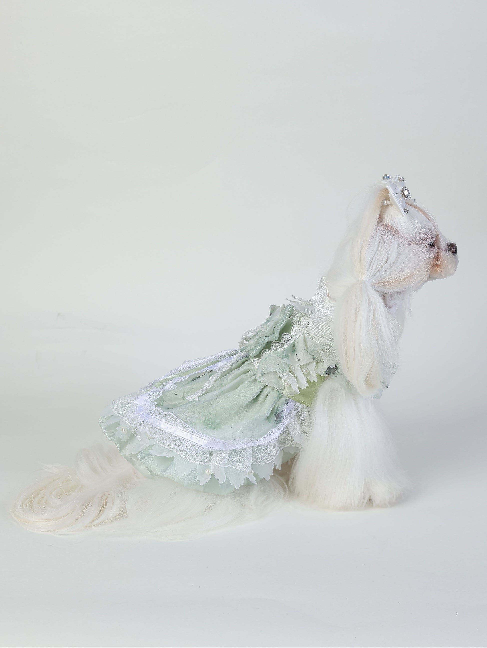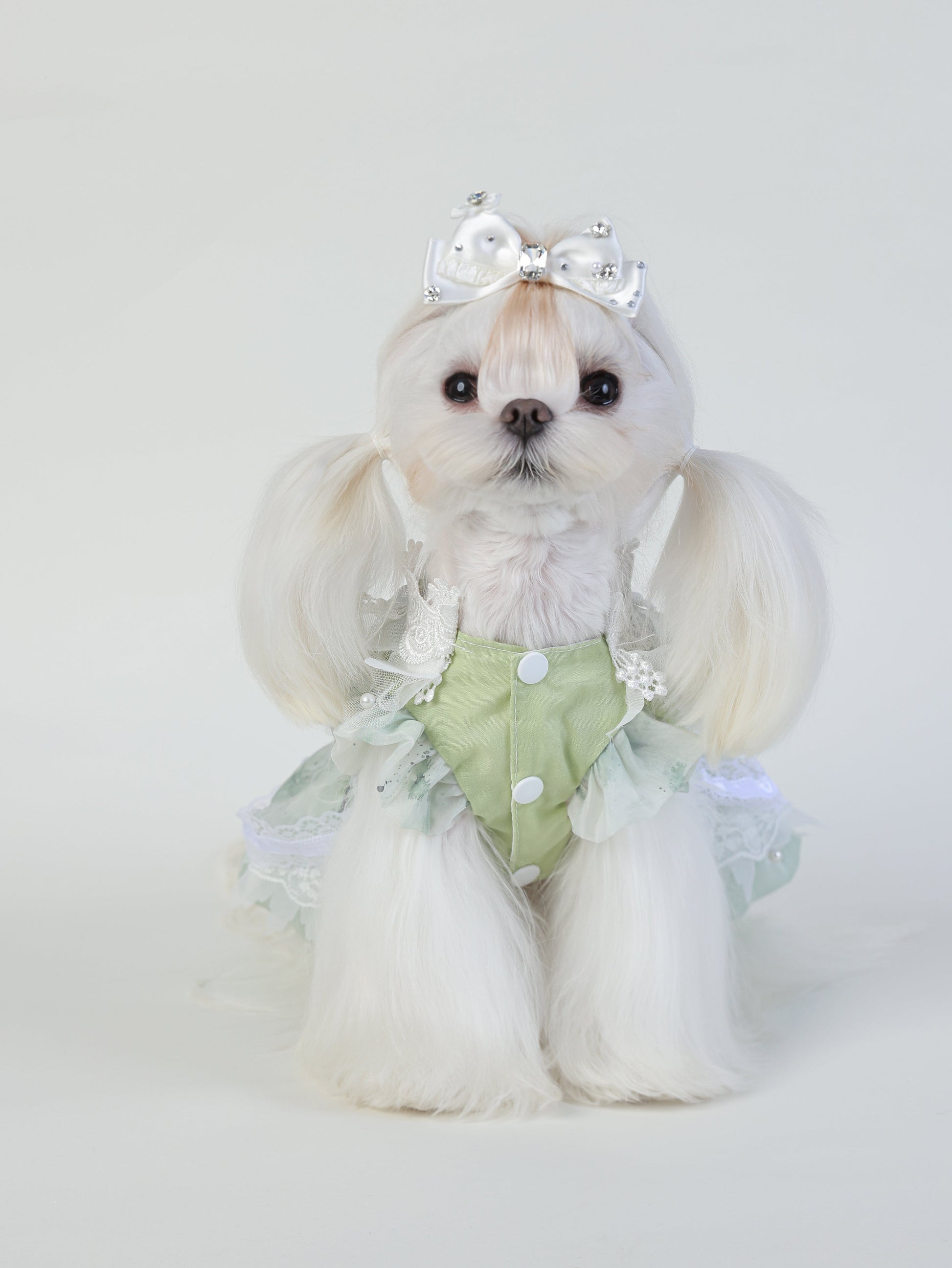 Jade Whisper is a soft, ethereal pet dress in a dreamy green hue, adorned with pearl lace and white trim—perfect for a look that's both elegant and serene.