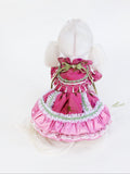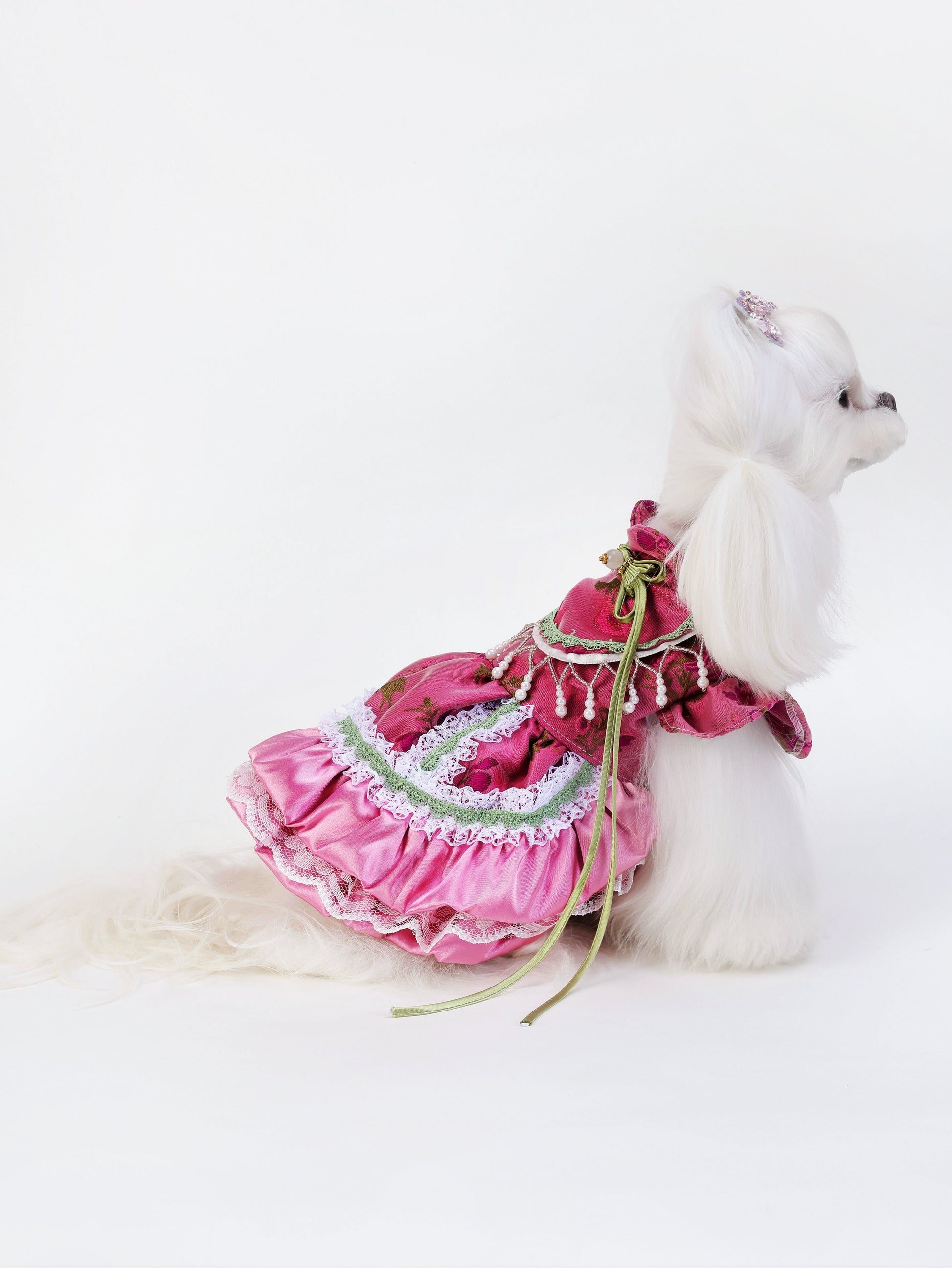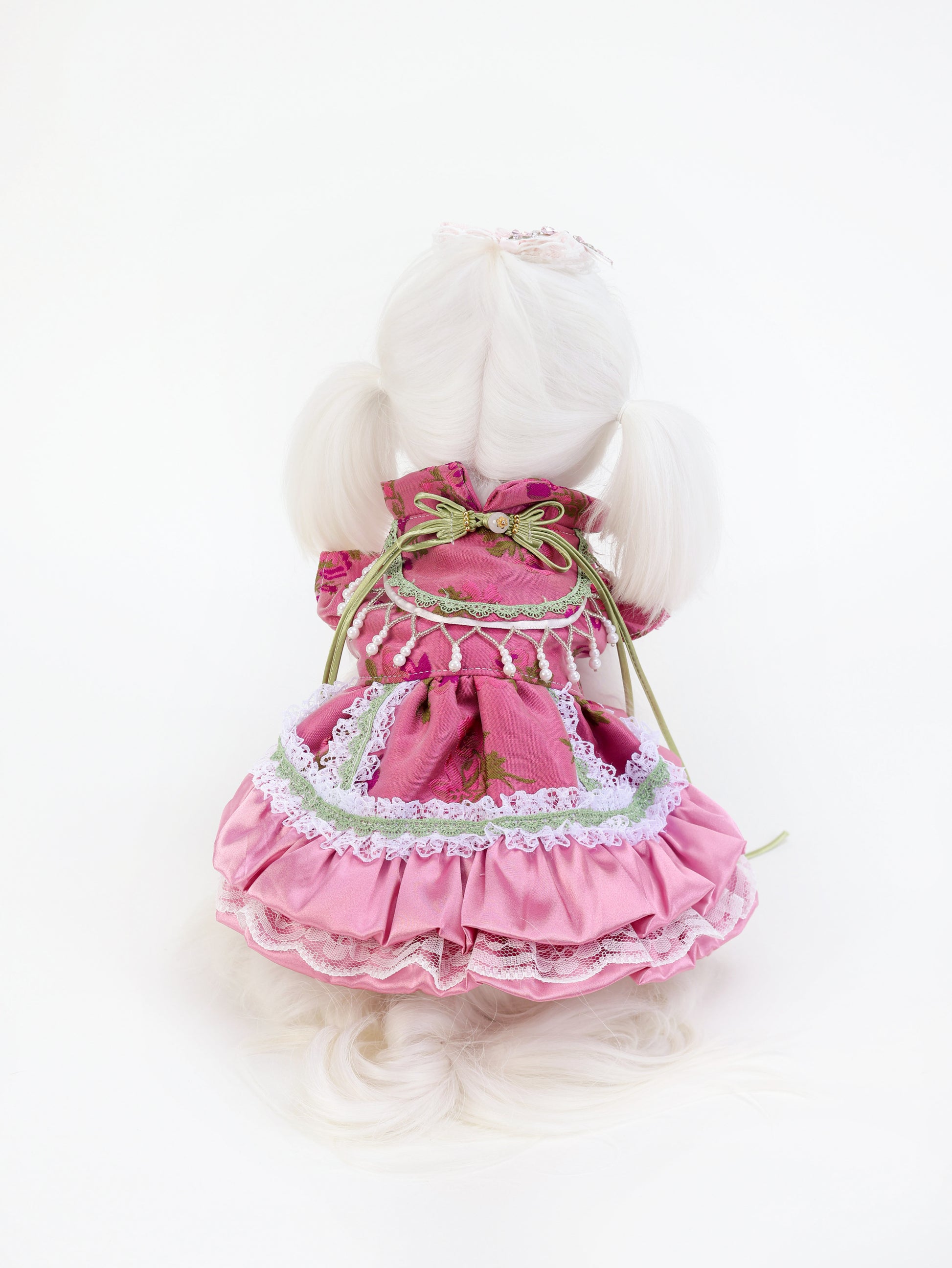 Featuring deep rose tones and contrasting green accents, this piece stands out with a bold floral brocade pattern. The layered lace hem and ornamental pearl strings enhance its richness. It is a statement piece with refined vintage appeal.