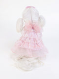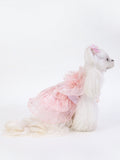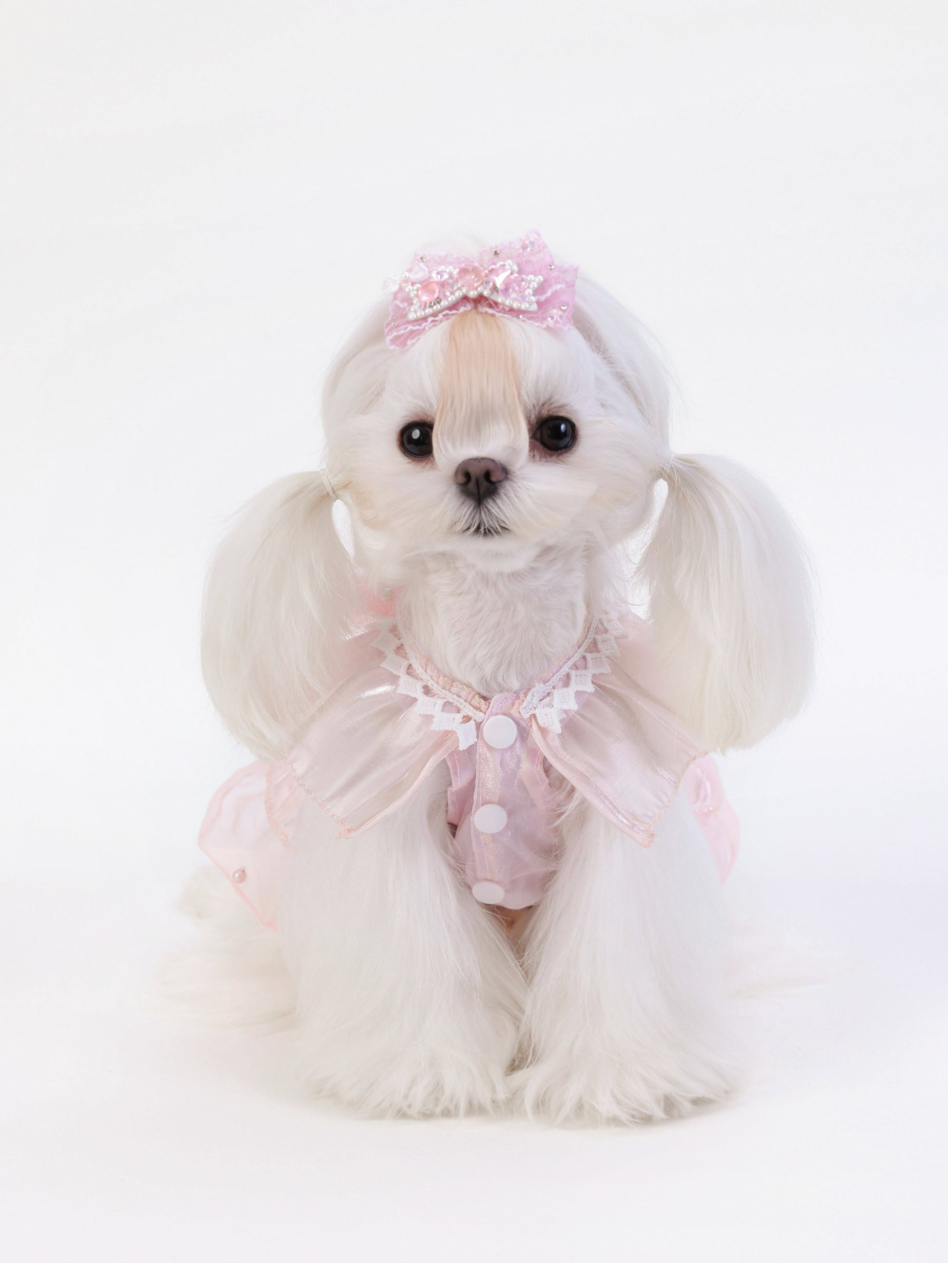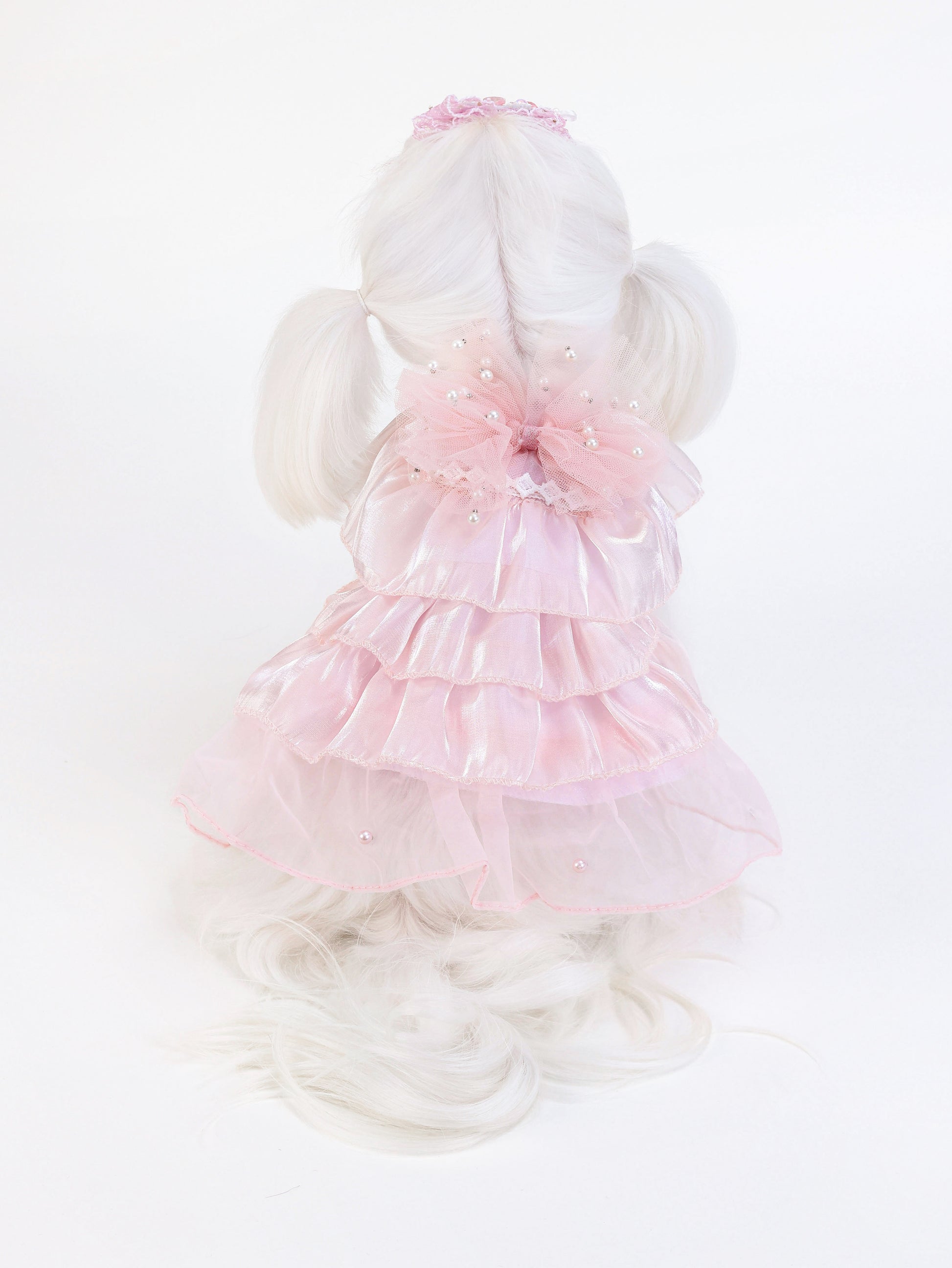 Pearl RuffleThis elegant pink dress shines with iridescent fabric and layered ruffles. The pearl-studded bow exudes charm and sophistication. It’s an exquisite choice for special occasions.
