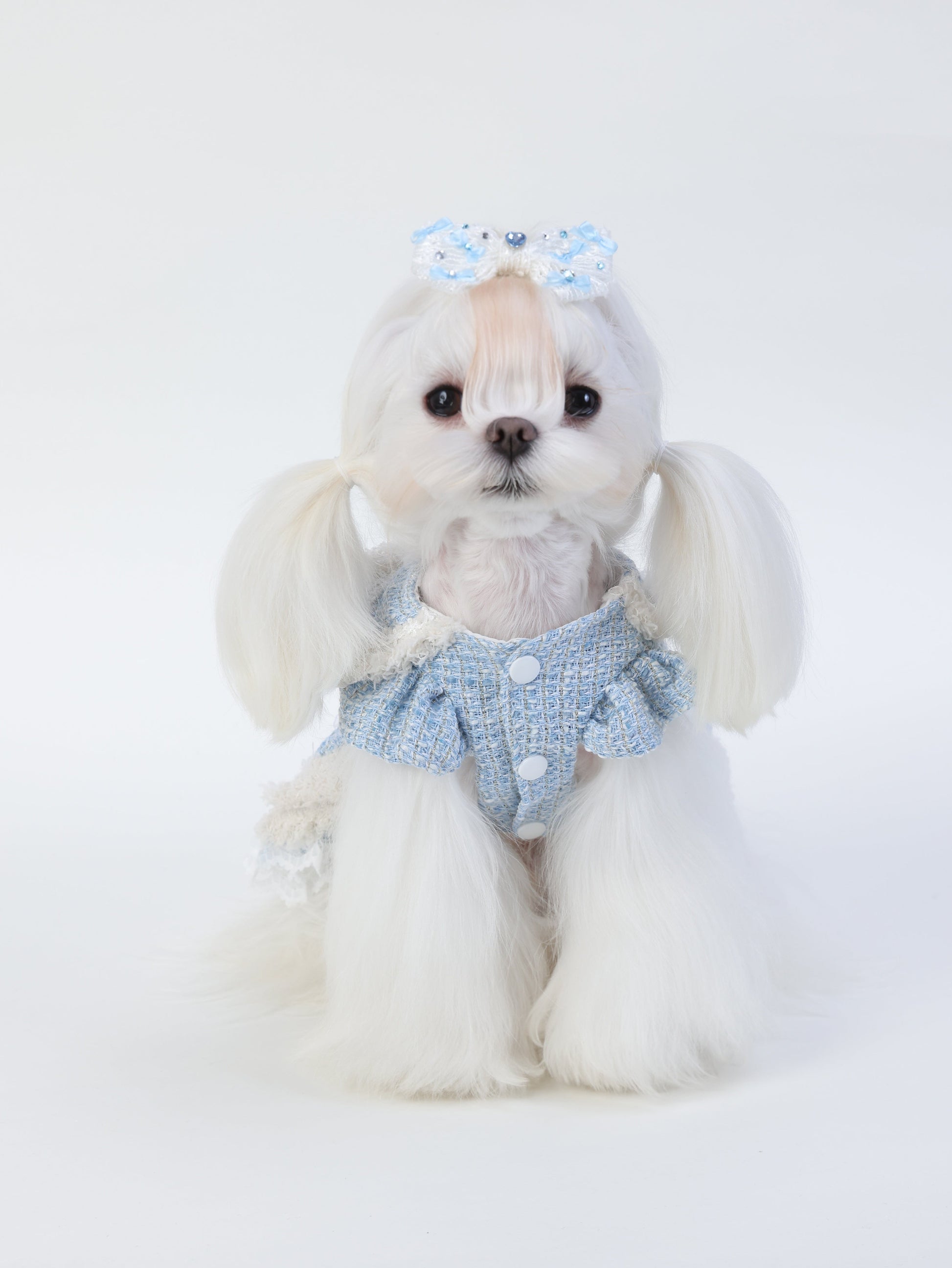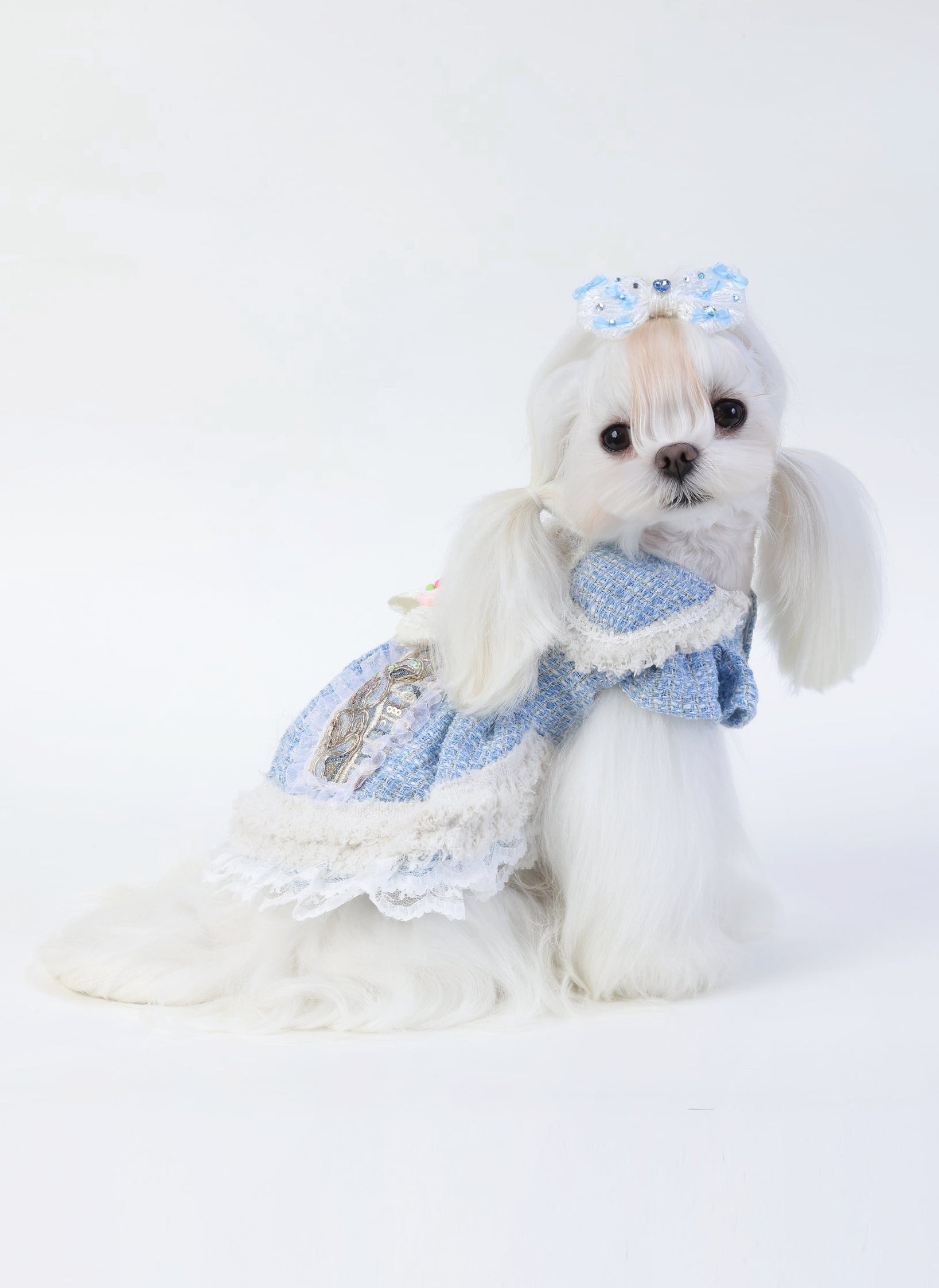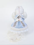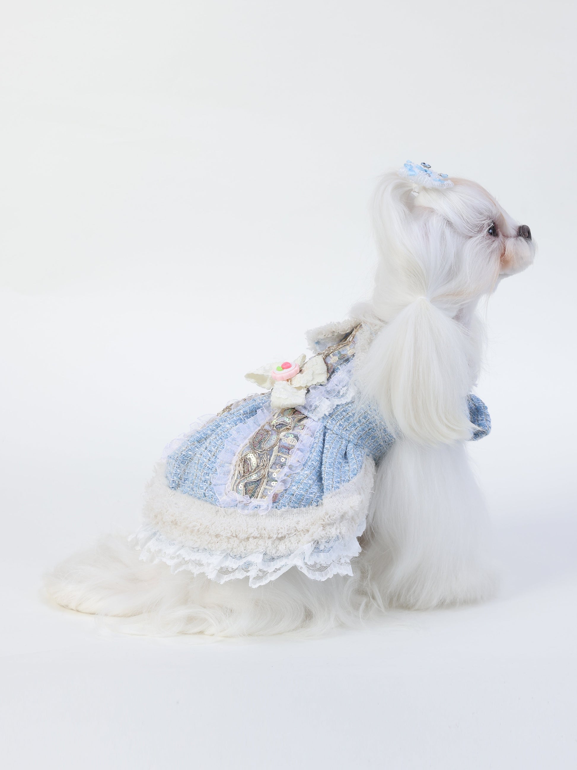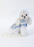 Frosted Charm brings cozy elegance with a touch of vintage flair. This pet dress features textured tweed, creamy faux fur trim, and pastel embroidery. Topped with a pearl-trimmed bow and rose button, it's a winter wonderland in every stitch.