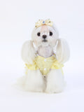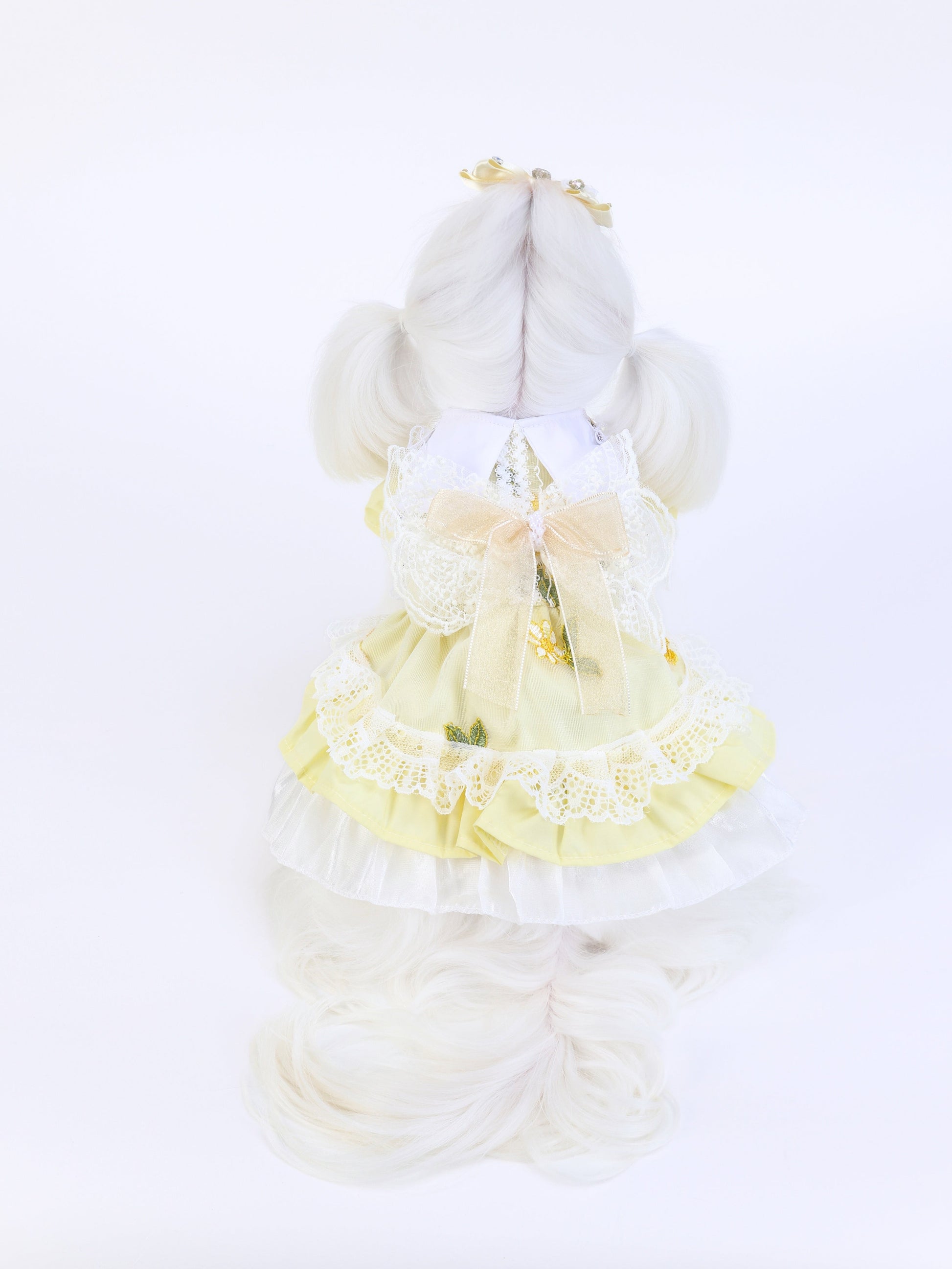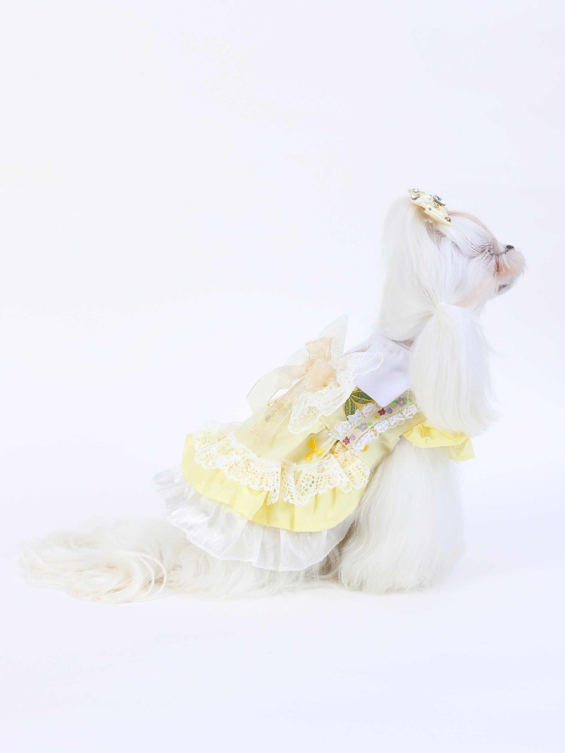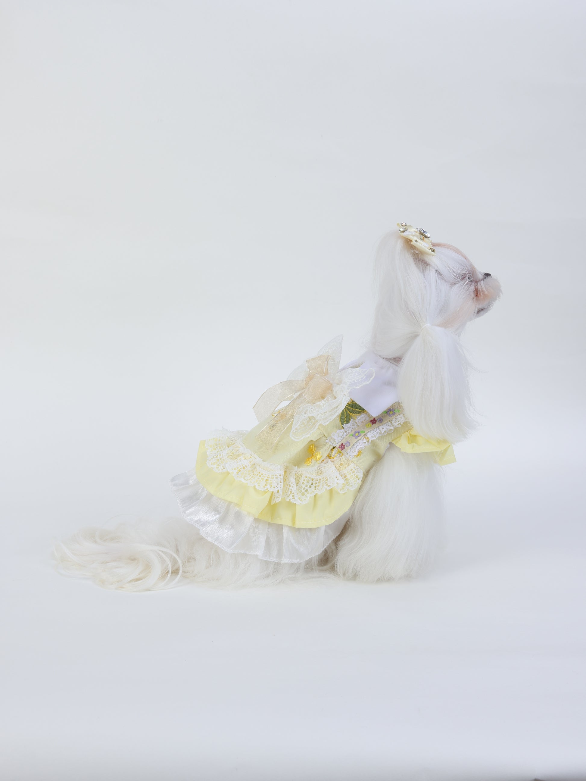 Lemon Whip is a sunny pet dress full of springtime delight and soft textures. Delicate lace, fluffy trim, and floral embroidery meet layers of pastel yellow ruffles. Finished with a sheer ribbon bow and matching ear accessory, it's pure joy in a dress.