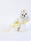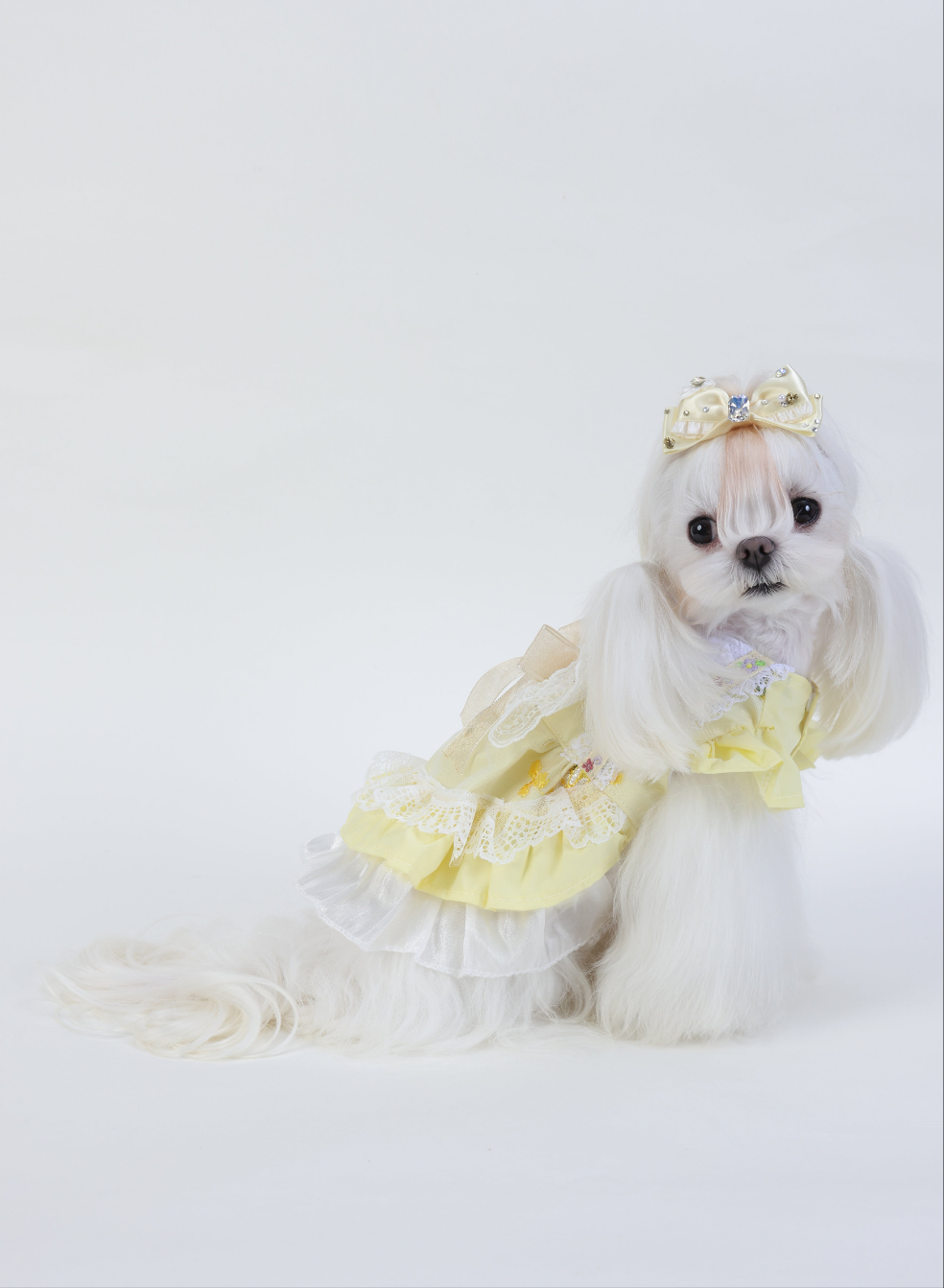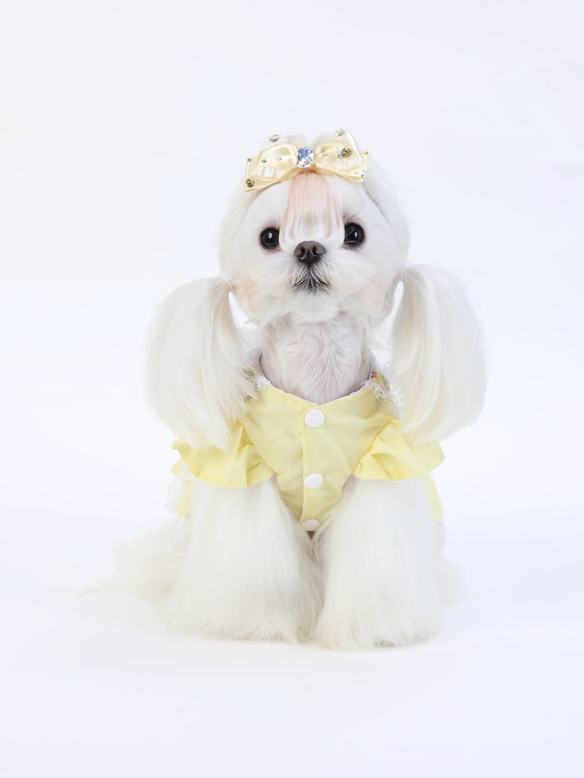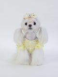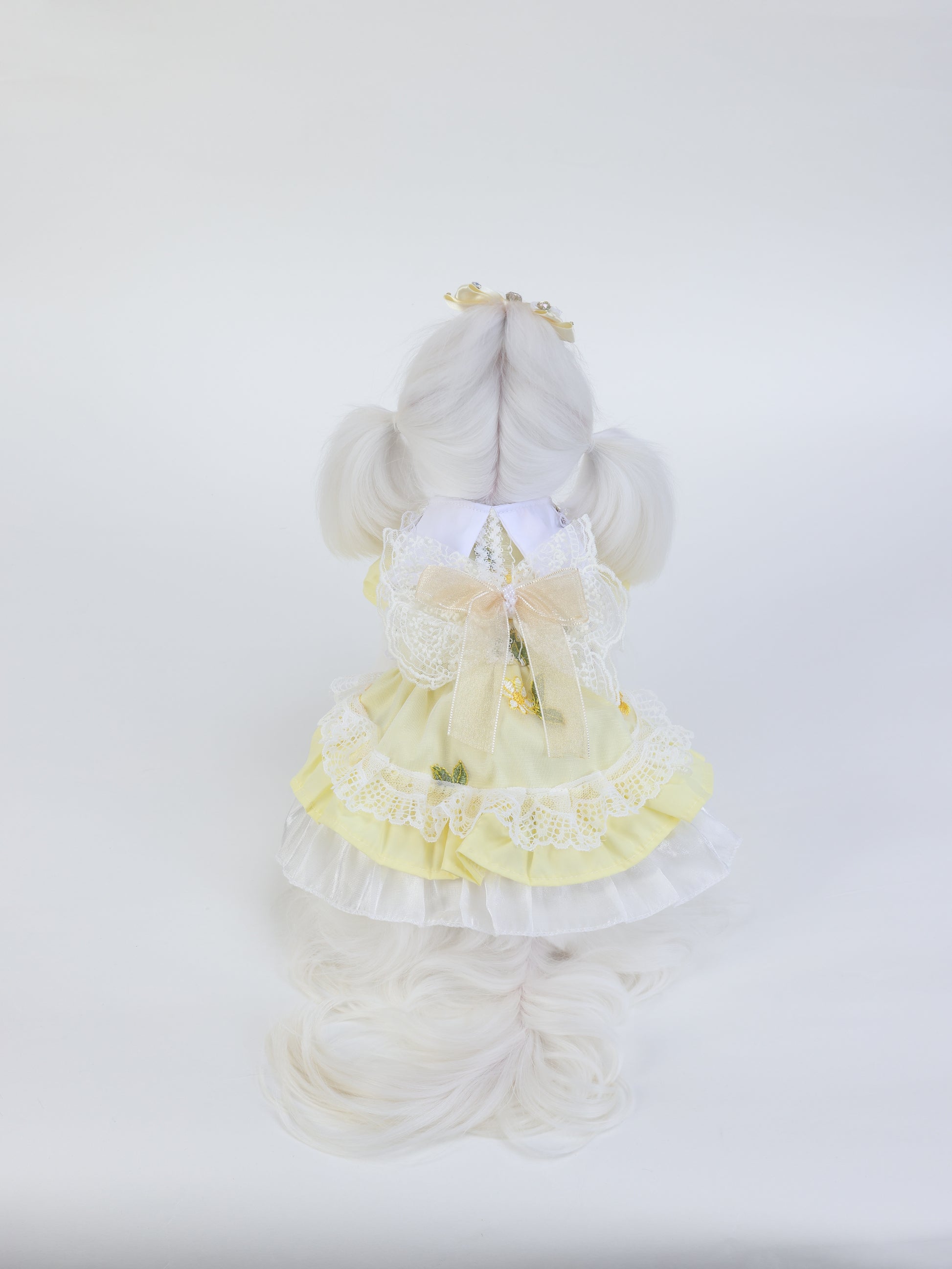 Lemon Whip is a sunny pet dress full of springtime delight and soft textures. Delicate lace, fluffy trim, and floral embroidery meet layers of pastel yellow ruffles. Finished with a sheer ribbon bow and matching ear accessory, it's pure joy in a dress.