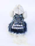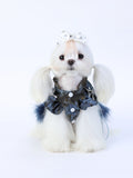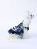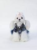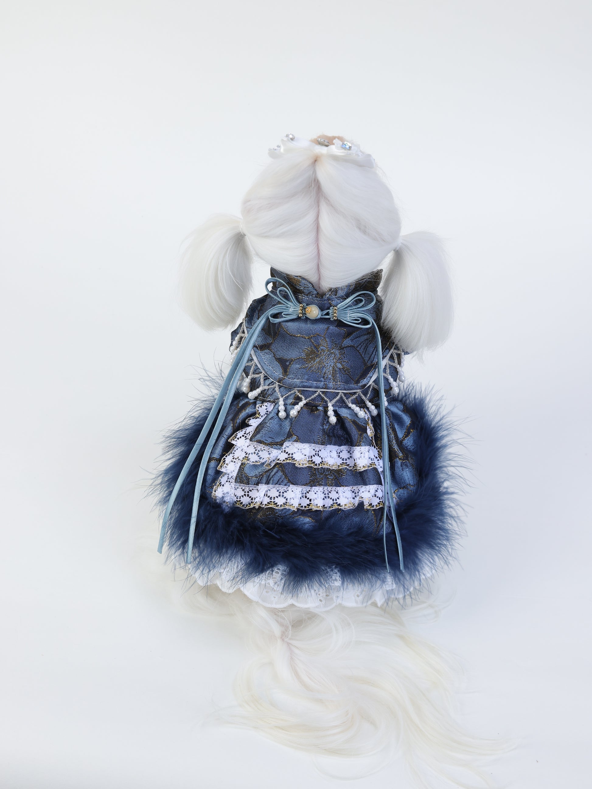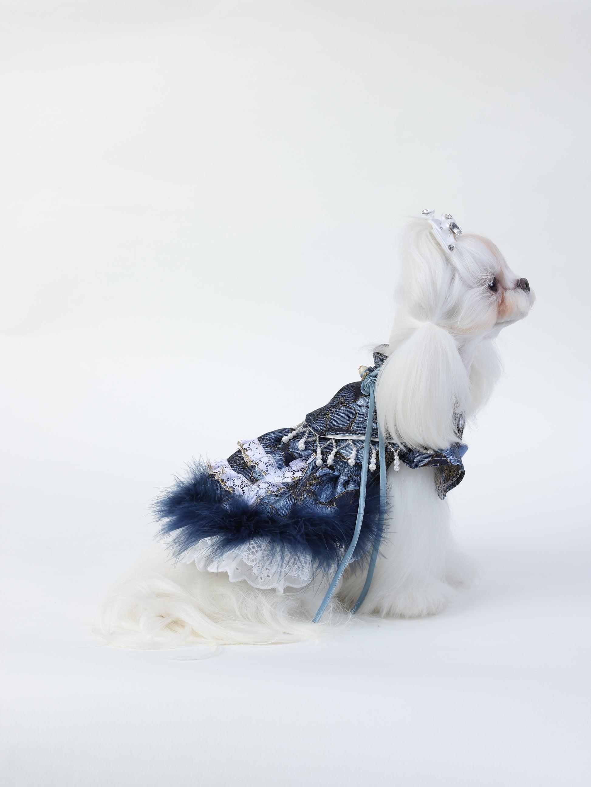 Moon Drape is a graceful pet dress inspired by moonlit nights and soft elegance. Featuring rich navy fabric, delicate lace trim, and fluttery feather accents. Adorned with pearl chains and a flowing blue bow, it’s perfect for a pet with star power.