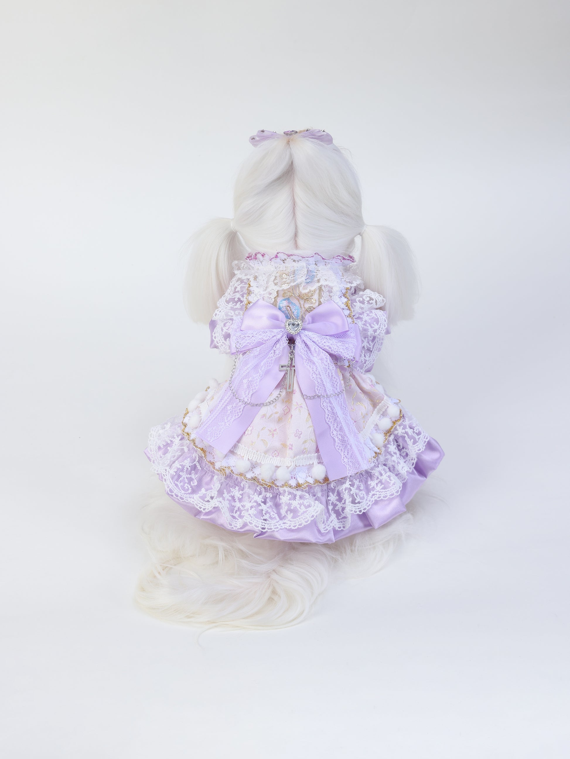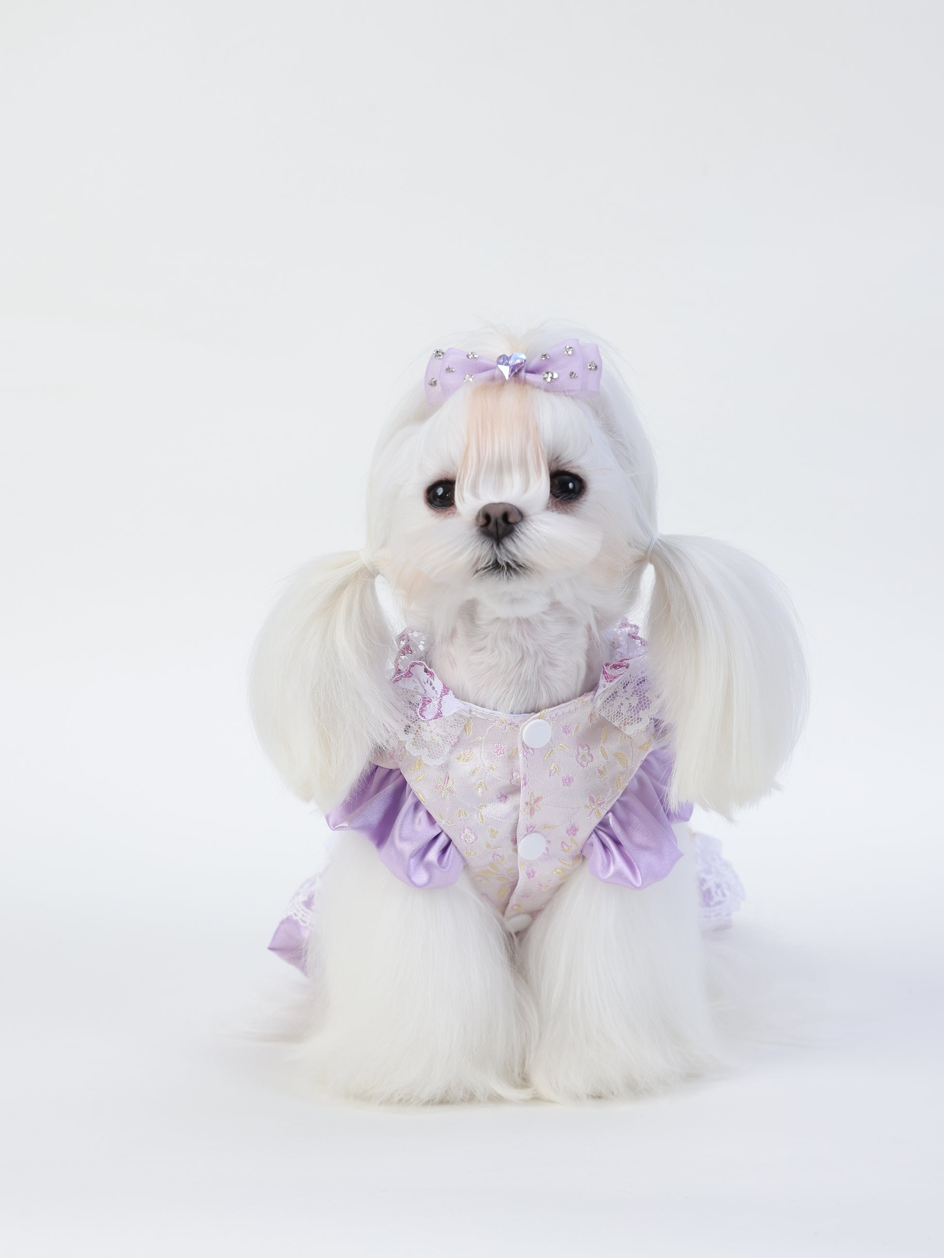 Inspired by the soft glow of amethyst jewels, Sweet Améthyste captures the essence of gentle luxury. Handcrafted with silky lavender fabric, layered lace, and a signature bow, this piece brings French elegance to every detail. Let your darling sparkle in timeless grace — a touch of sweetness wrapped in royal charm.
